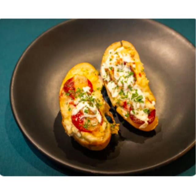 Papa al horno con Salchicha, crema, cebollín y nuestro queso mozzarella, sin duda, un clásico