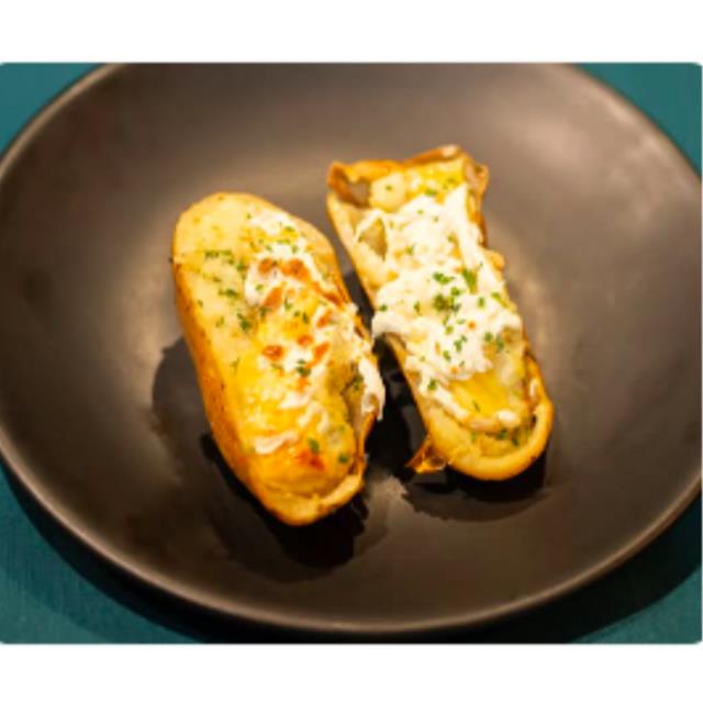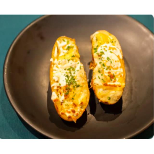 Papa al horno con salsa de quesos Mozzarella, Gorgonzola, provolone y cebollín, el especial de la casa