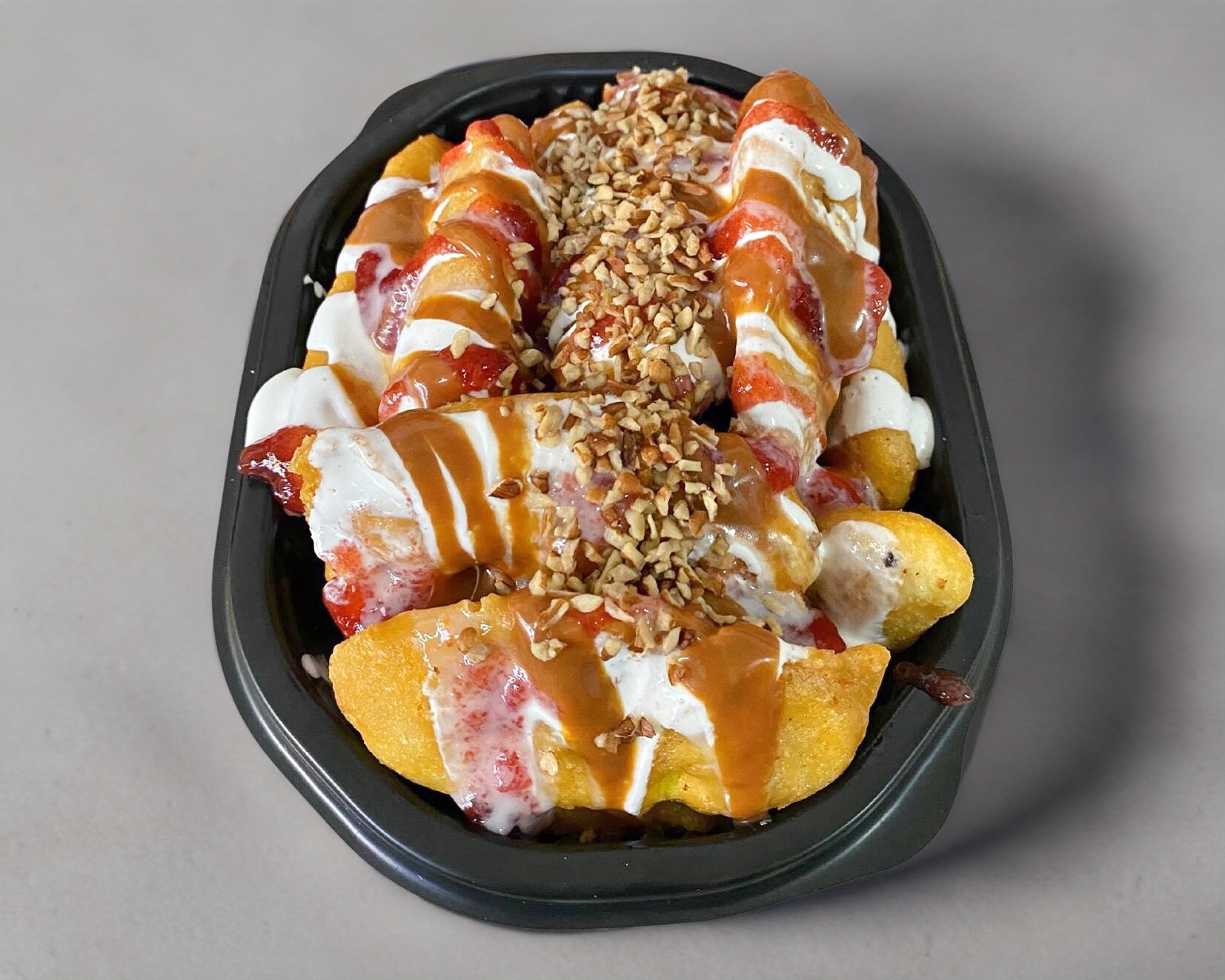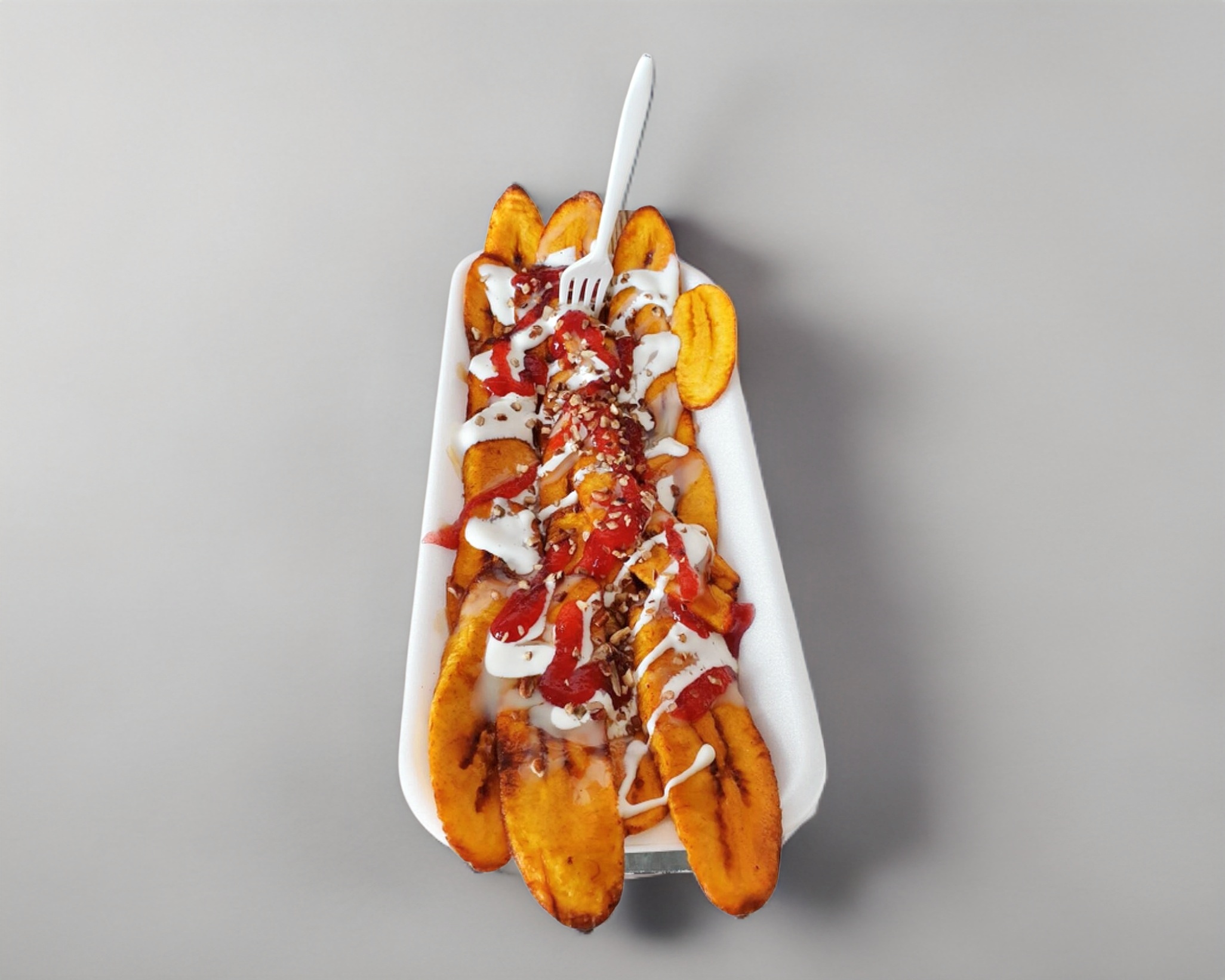 Dos piezas de plátano macho en rebanadas, fritas y acompañadas con los toppin de tu elección