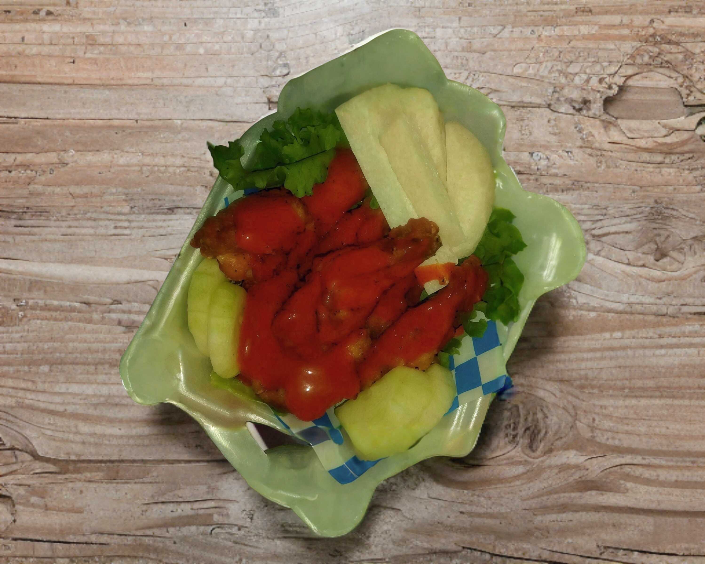 6 piezas de alitas con porción completa de las papas, incluye la verdura del día.