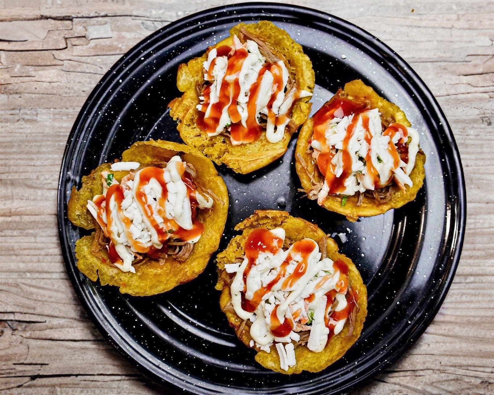 4 tostones de plátano macho verde acompañados de carne mechada, ensalada rayada, queso blanco y salsas de la casa. ¡Al estilo playero venezolano!