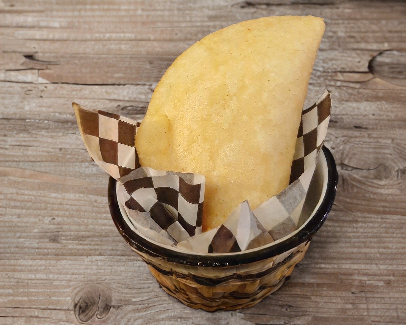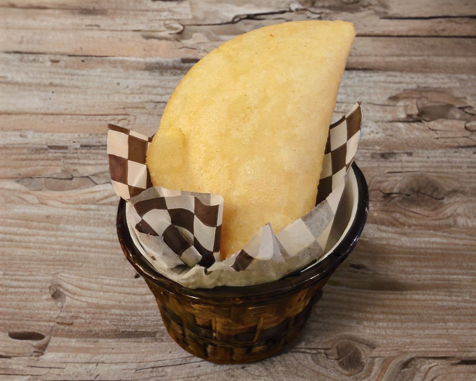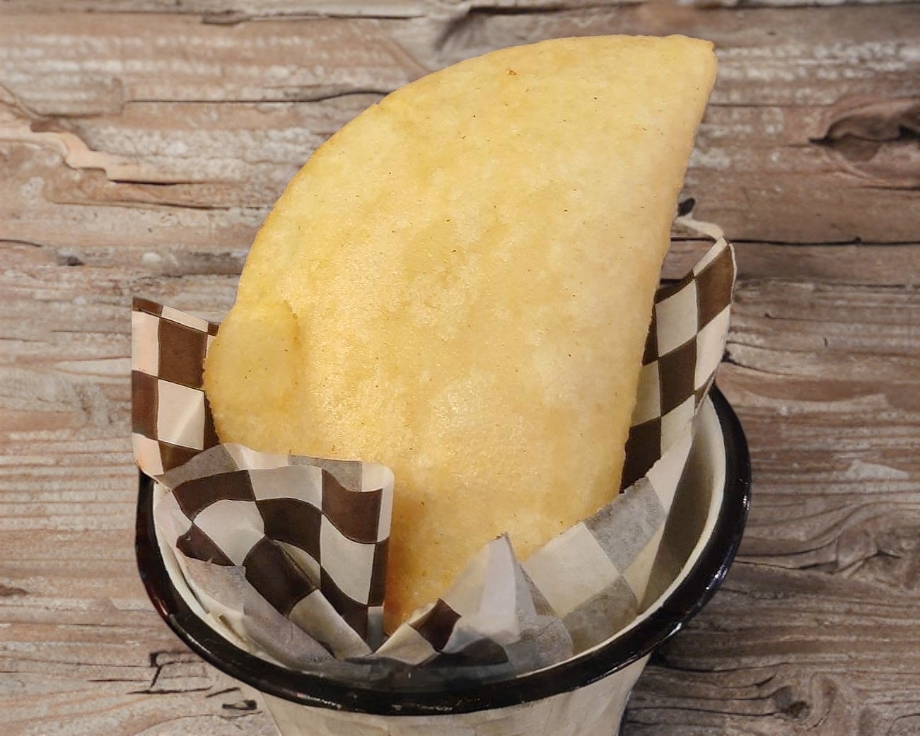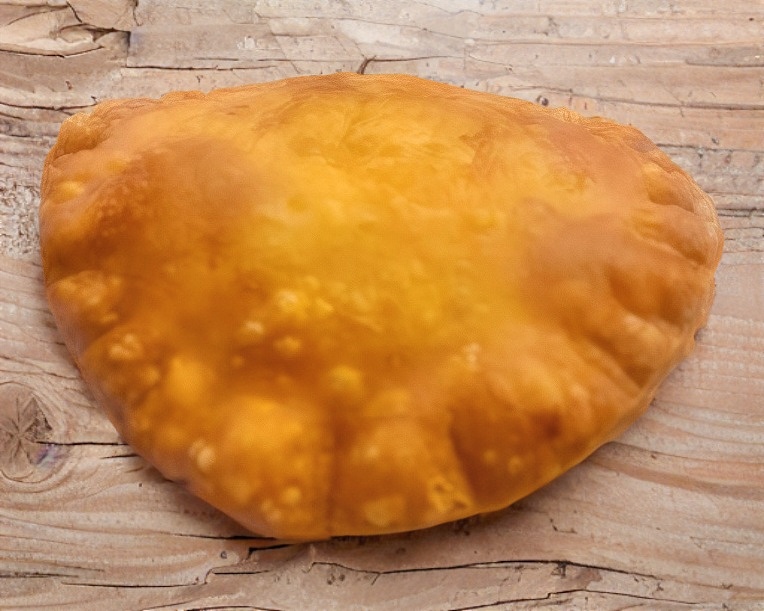Una pieza de empanada de harina de maiz, rellena de carne deshebrada.