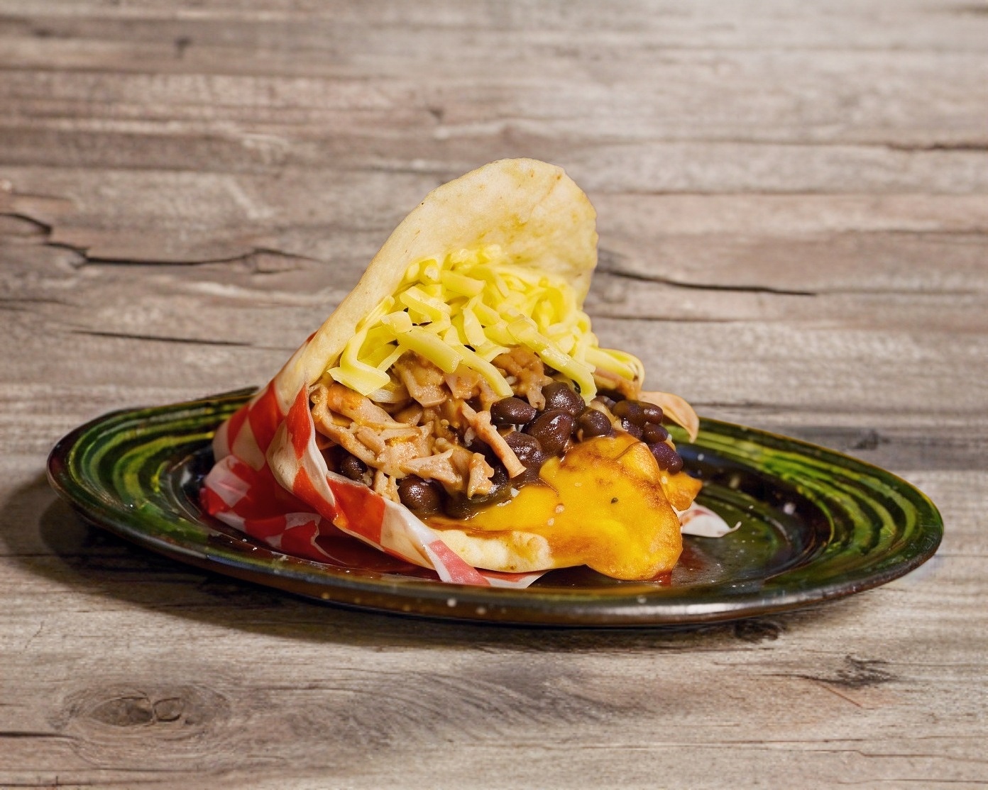 Arepa rellena de carne mechada, frijoles, tajadas de platano macho, y queso amarillo.