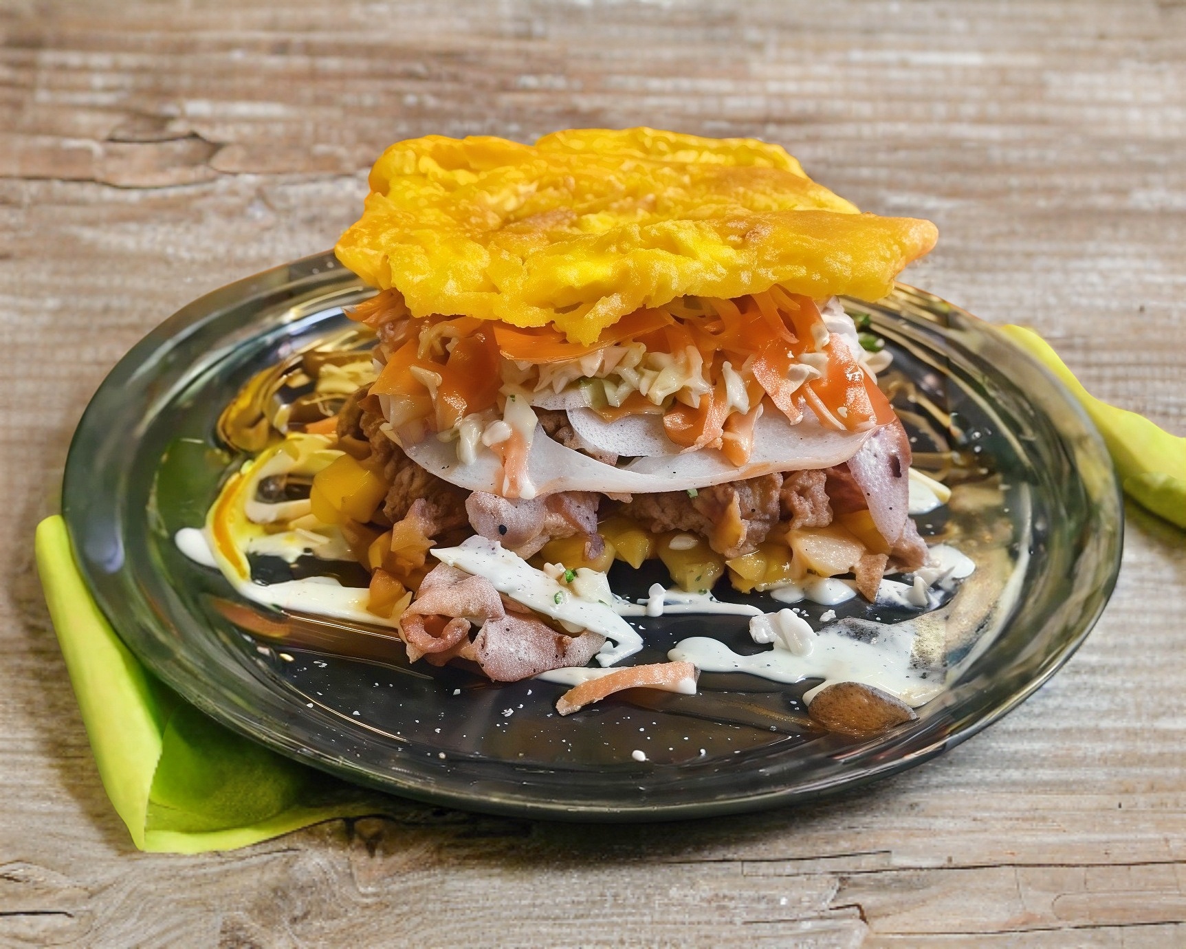 Plátano frito, carne deshebrada, ensalada rayada, jamón, tocino, queso derretido y salsas.