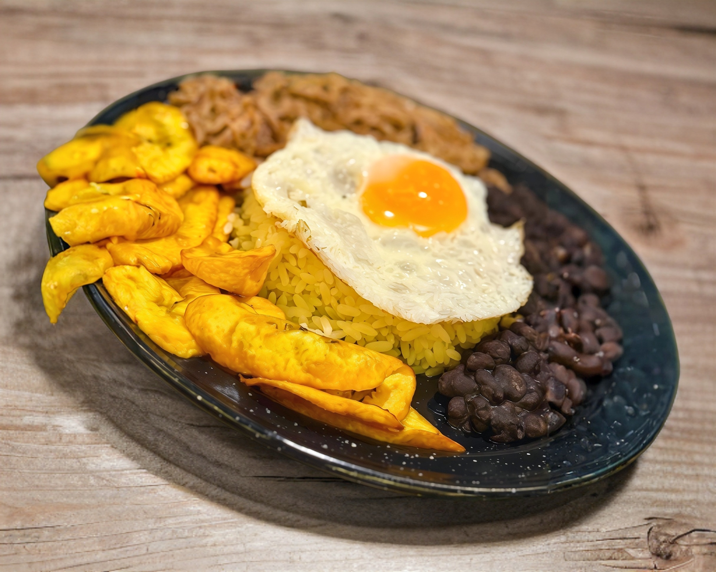 Carne deshebrada, frijoles negros, tajadas de platano macho, arroz blanco y huevo estrellado.