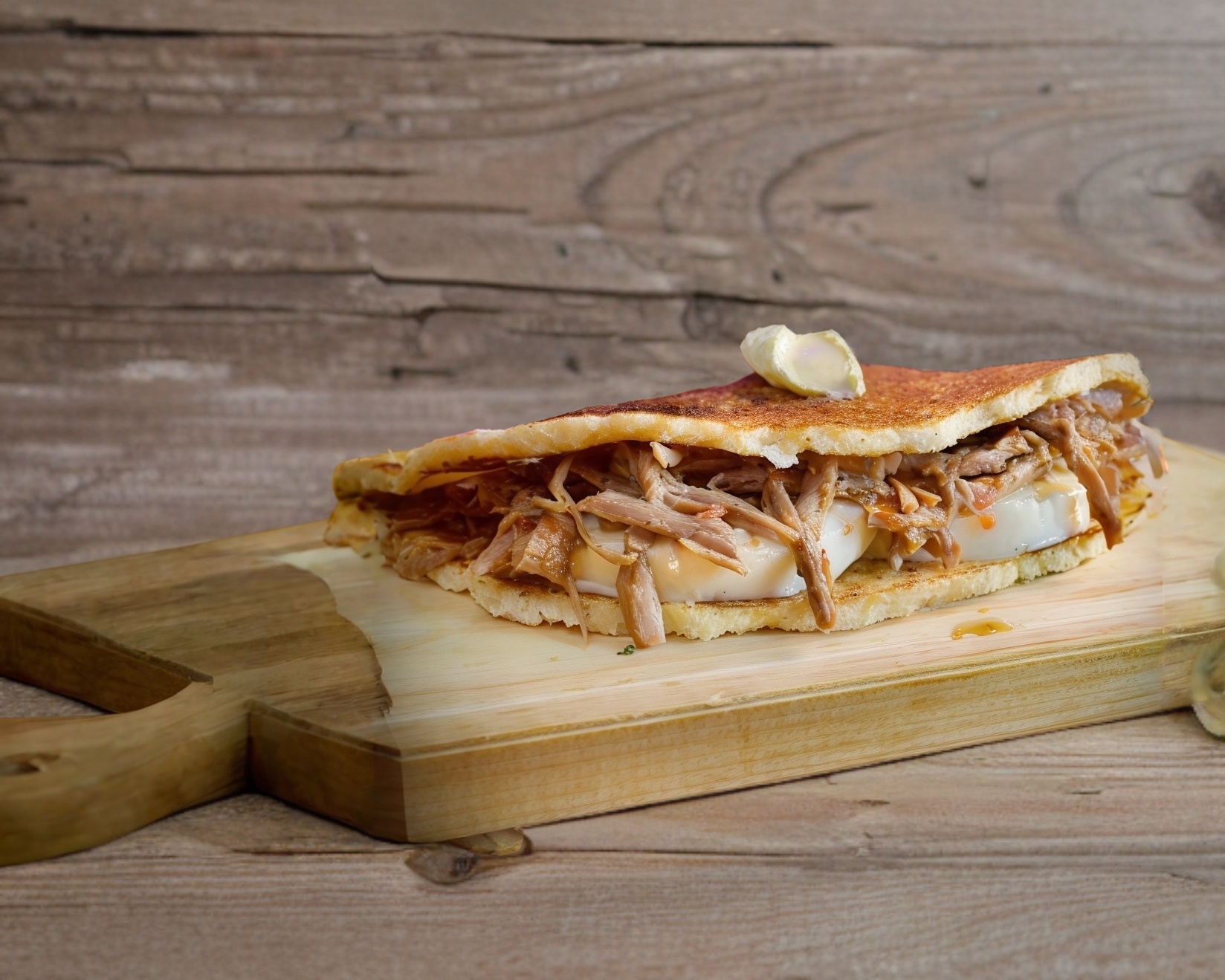 Pollo deshebrado, aguacate, mayonesa y queso.