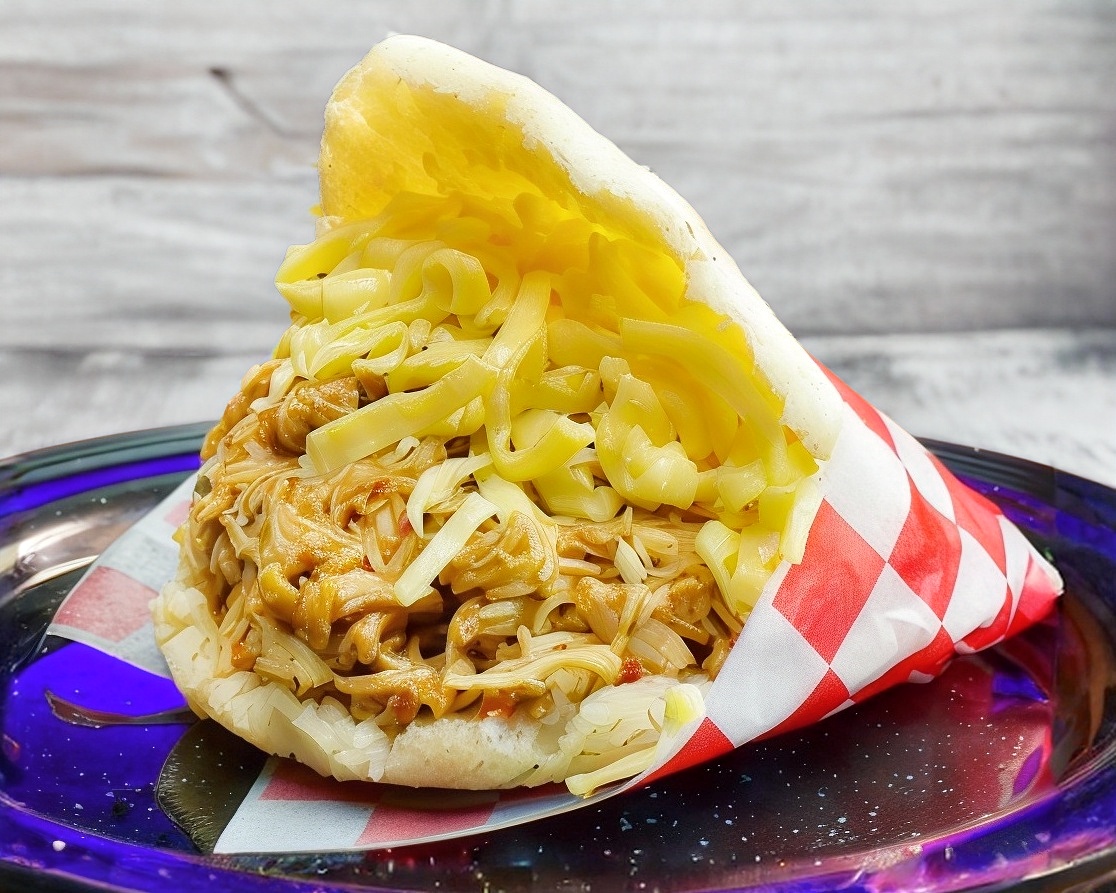 Masa de maiz dulce acompañada de queso de mano venezolano con pollo mechado.