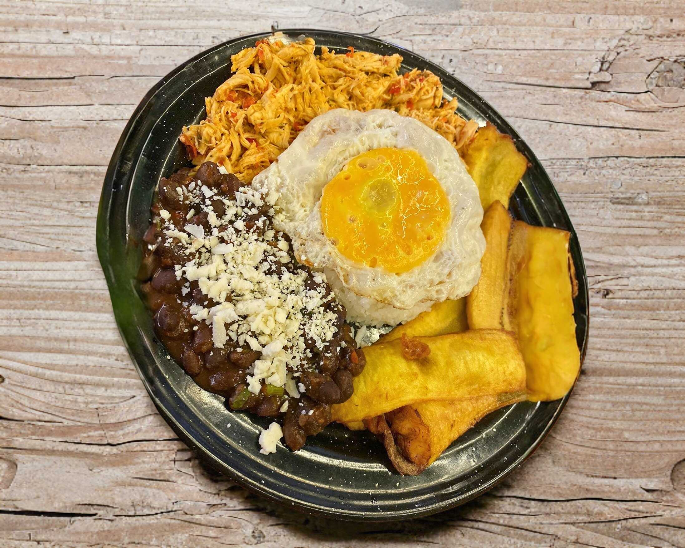 Pollo deshebrado, frijoles negros, tajadas de platano macho, arroz blanco y un huevo estrellado.