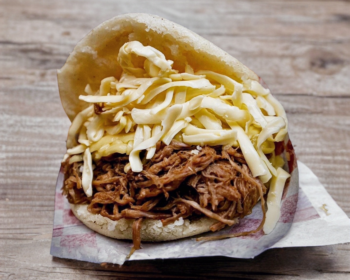 Masa de maiz dulce acompañada de queso de mano venezolano con carne mechada