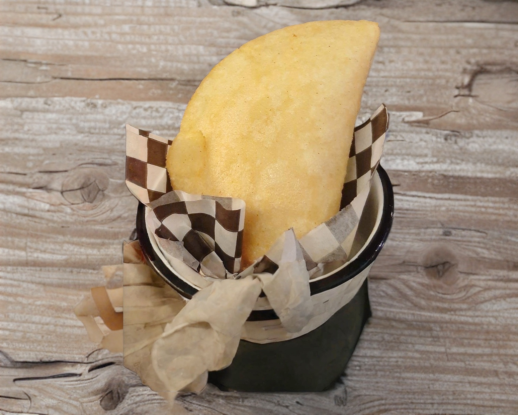 Una pieza empanada de harina de maiz, rellena de pollo deshebrado.