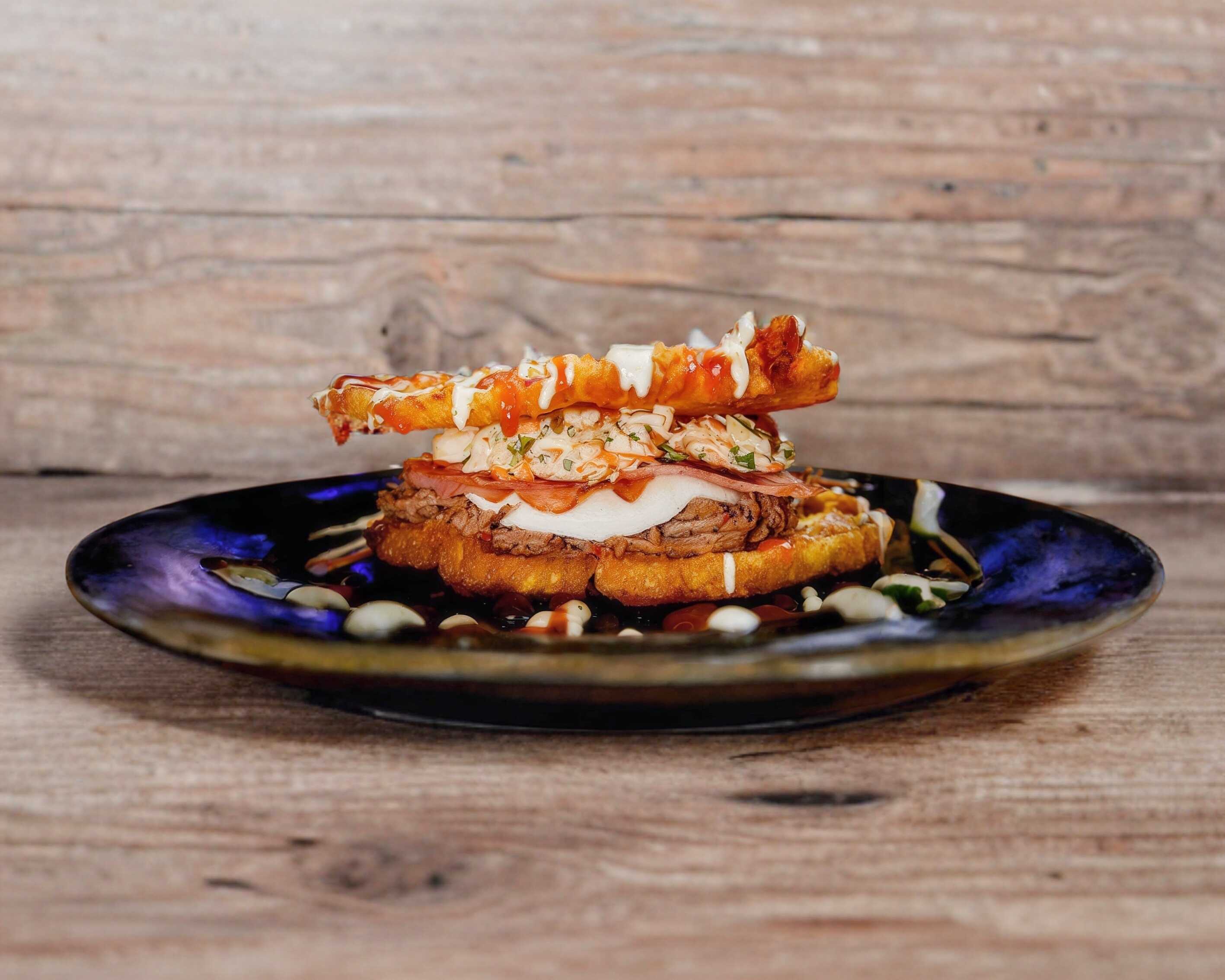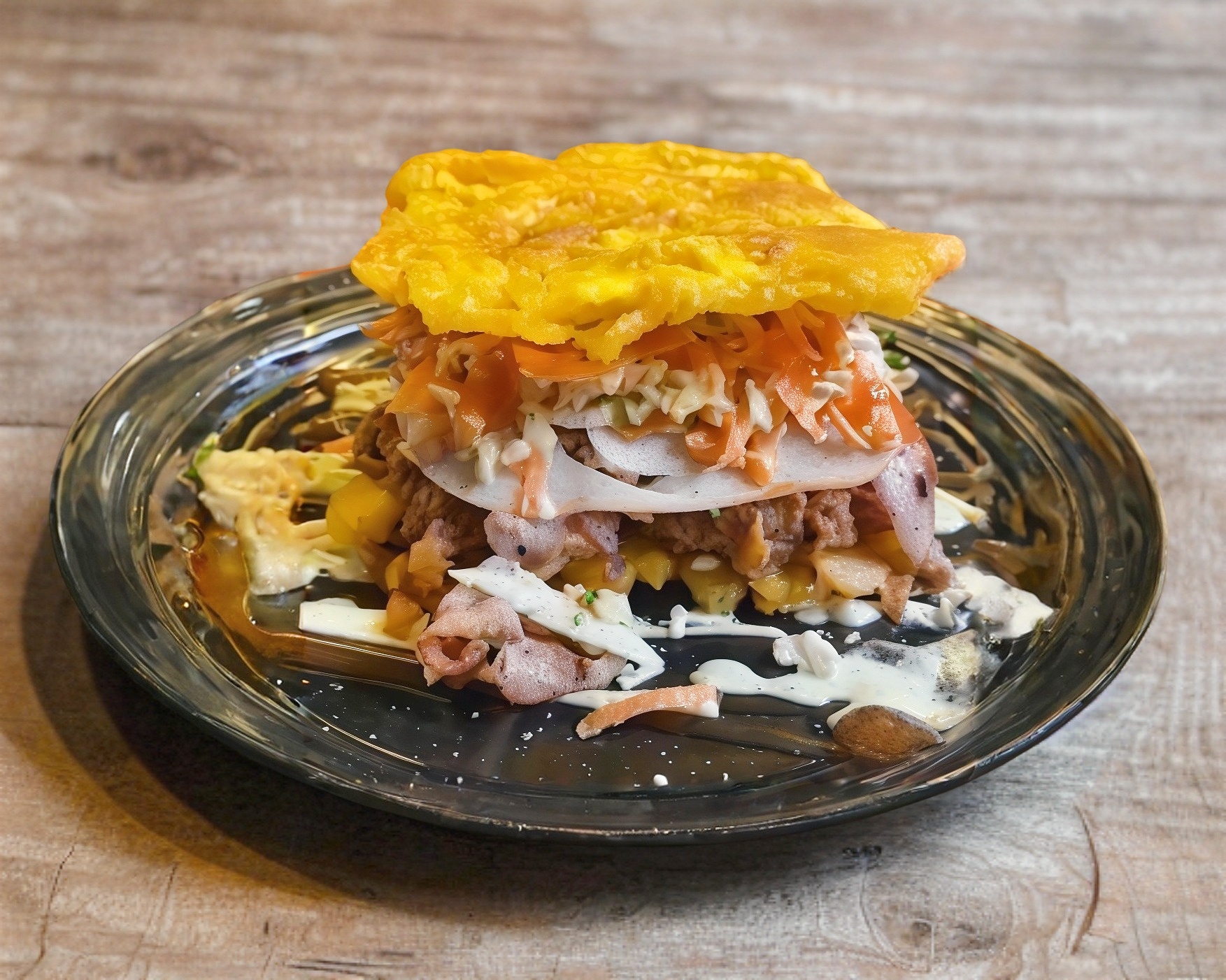 Plátano frito, pollo deshebrado, ensalada rayada, jamón, tocino, queso derretido y salsas.