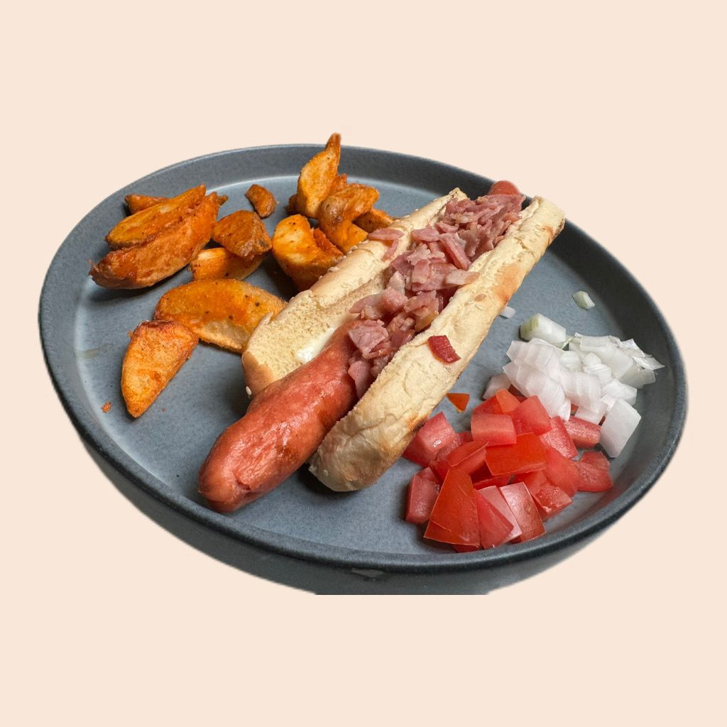 Hot dog de 25 cm con mayonesa, tocino, jitomate, cebolla y papas.