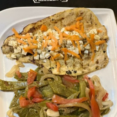 Pechuga de pollo acompañada de nopal y queso panela al grill con jitomate y cebolla.