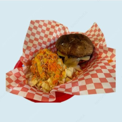 Dos portobellos en lugar de pan, abrazando carne master, queso panela y salsa de tomate. Acompañada de ensalada fresca.
