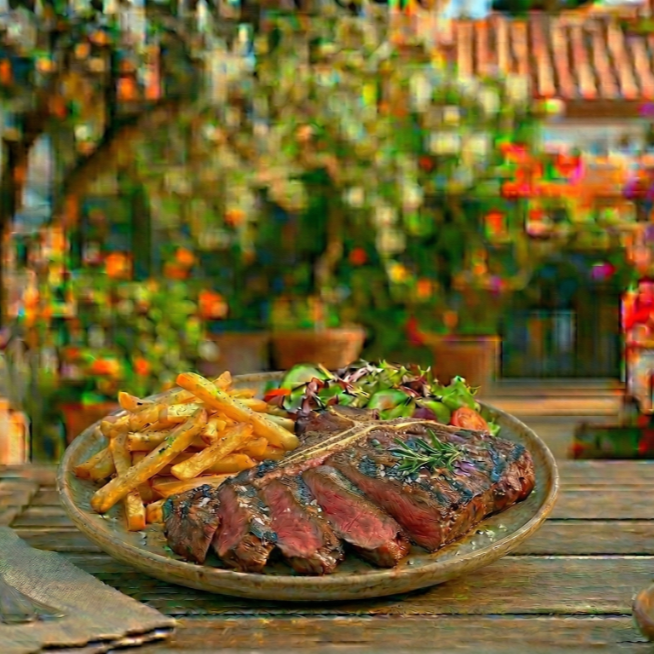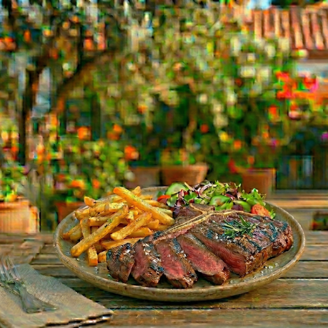 Corte al carbón de t-bone acompañado de ensalada y papas a la francesa.