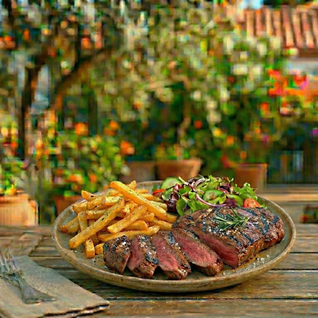 Corte al carbón de churrasco acompañado de ensalada y papas a la francesa.