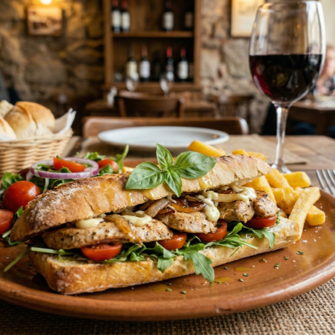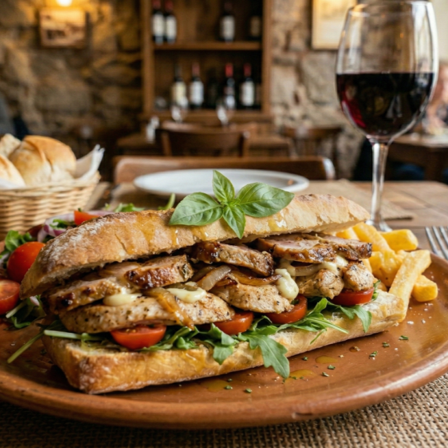 Baguette con pollo a la plancha, cebolla morada y aderezo.