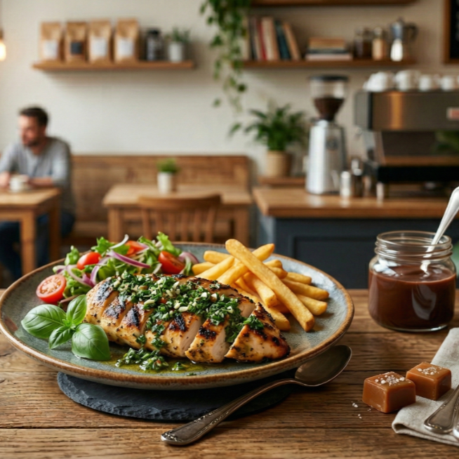 Pechuga a la plancha bañada en chimichurri con papas y ensalada.