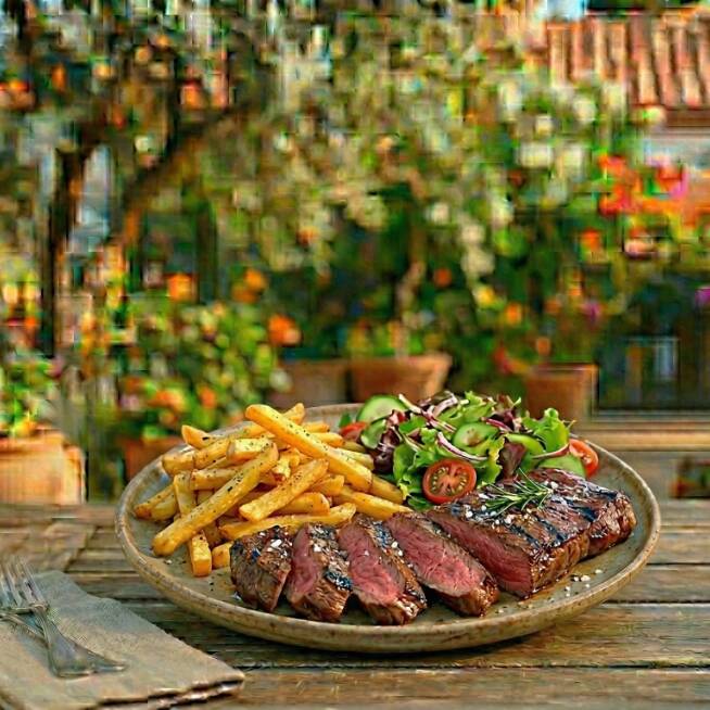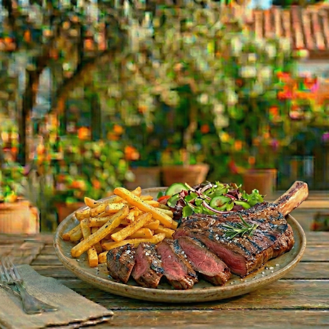 Cow boy al carbón acompañado de ensalada y papas a la francesa.