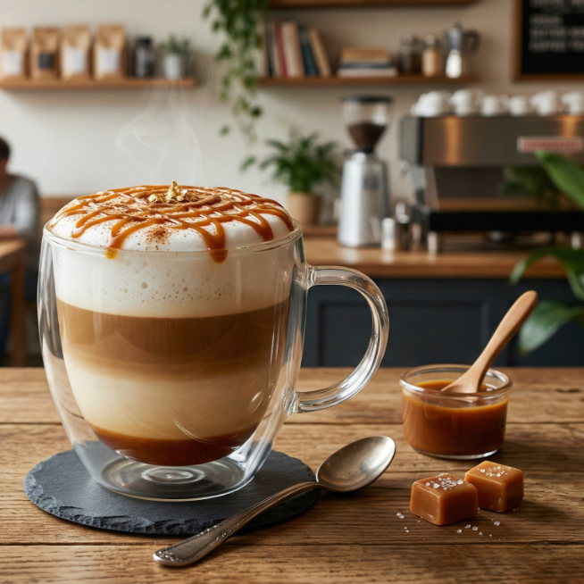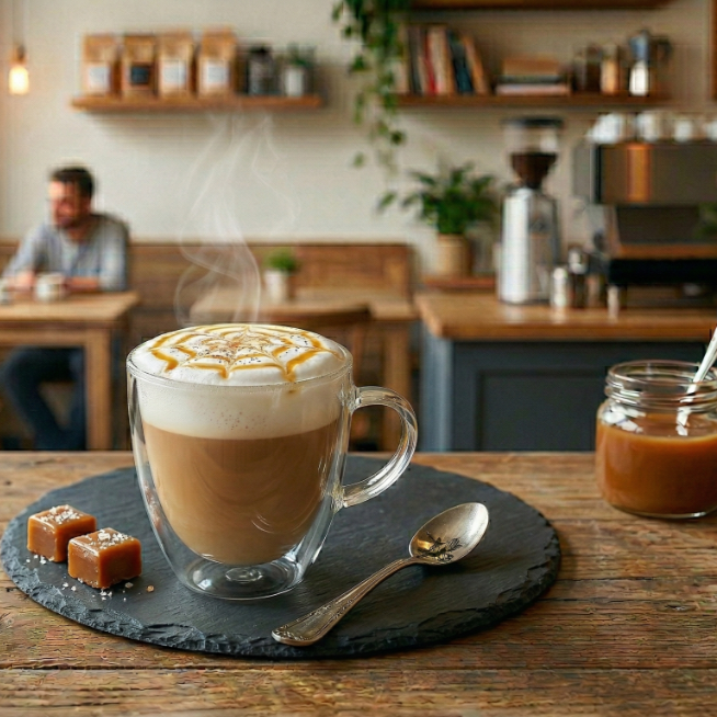 Latte de café con sabor a caramelo, servido en 350 ml.
