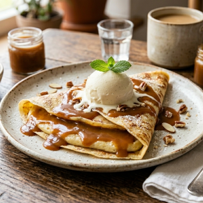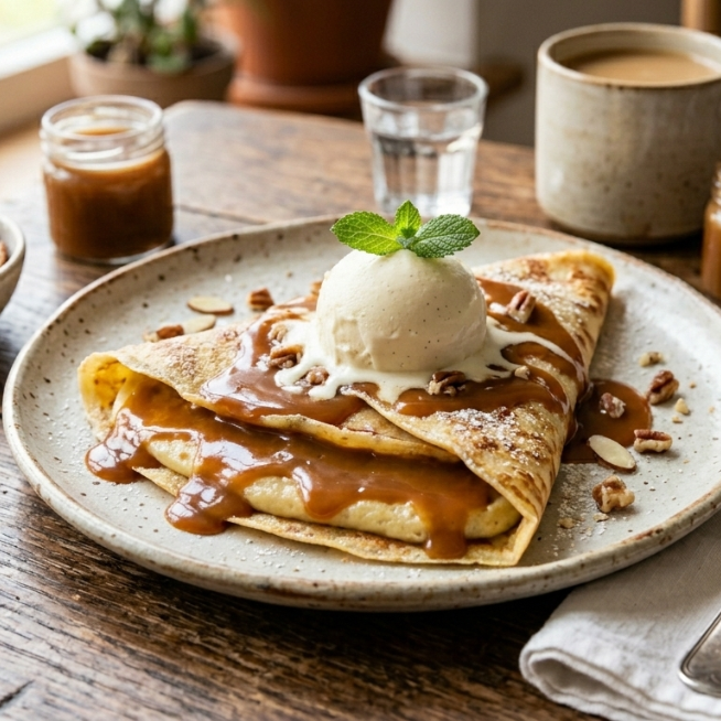Crepa de cajeta con helado de vainilla.