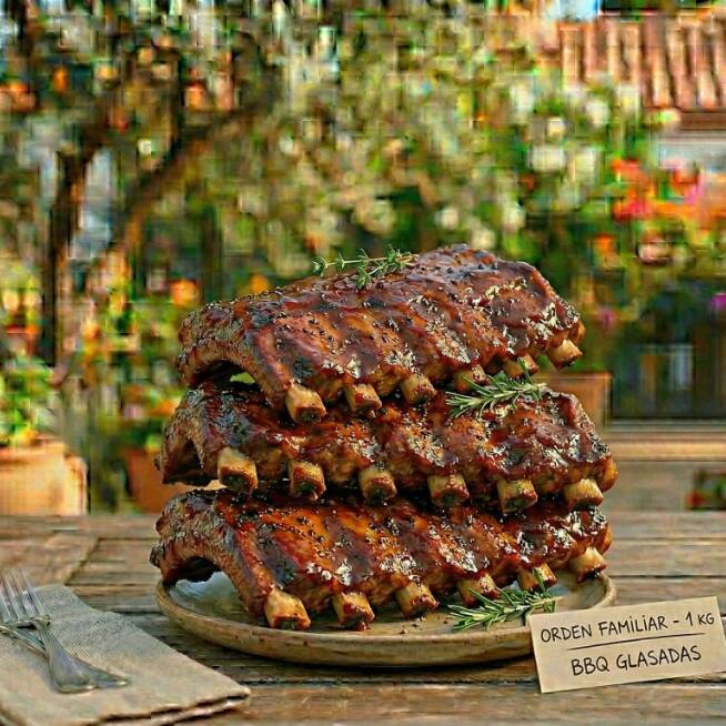 Orden familiar de costillas de cerdo, 1 kg, glaseadas con salsa BBQ.
