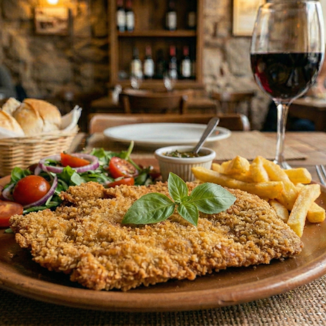 Milanesa crujiente con papas y ensalada.