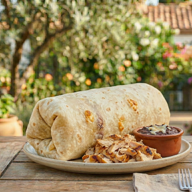 Tortilla grande rellena de pollo con frijoles y queso.