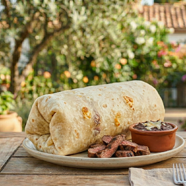 Tortilla grande rellena de arrachera con frijoles y queso.