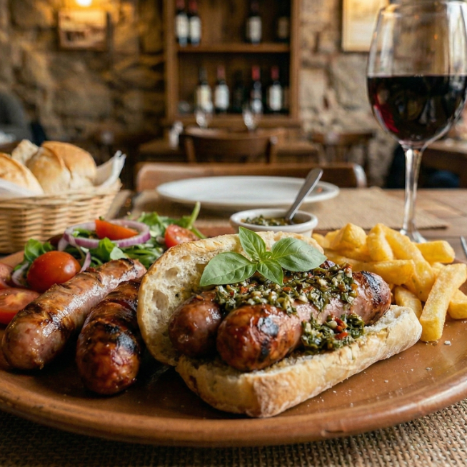 Chorizo argentino a la parrilla en pan baguette con chimichurri.
