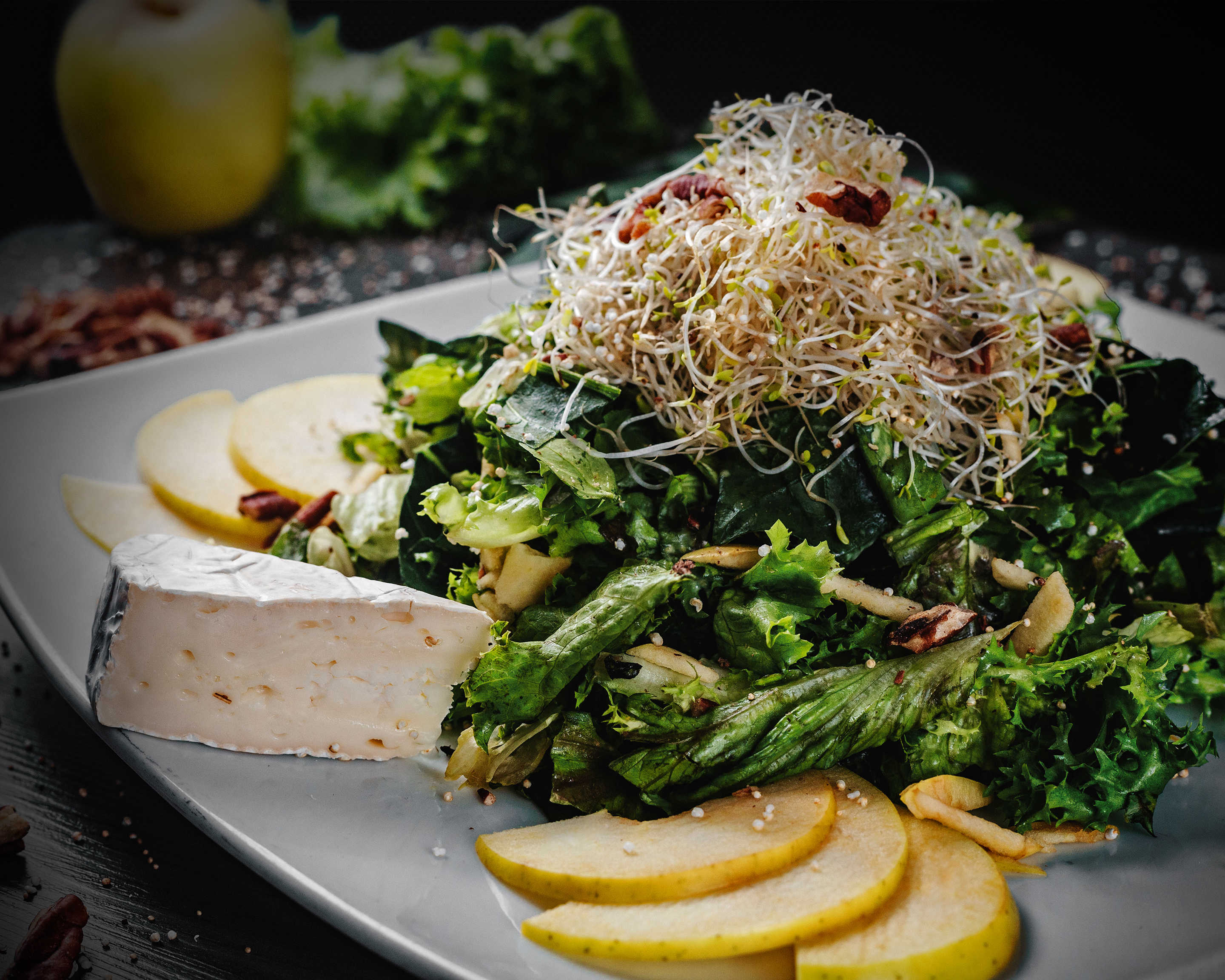 Mezcla de lechugas, manzana, espinaca, berro, germen de soya, queso camembert y amaranto.