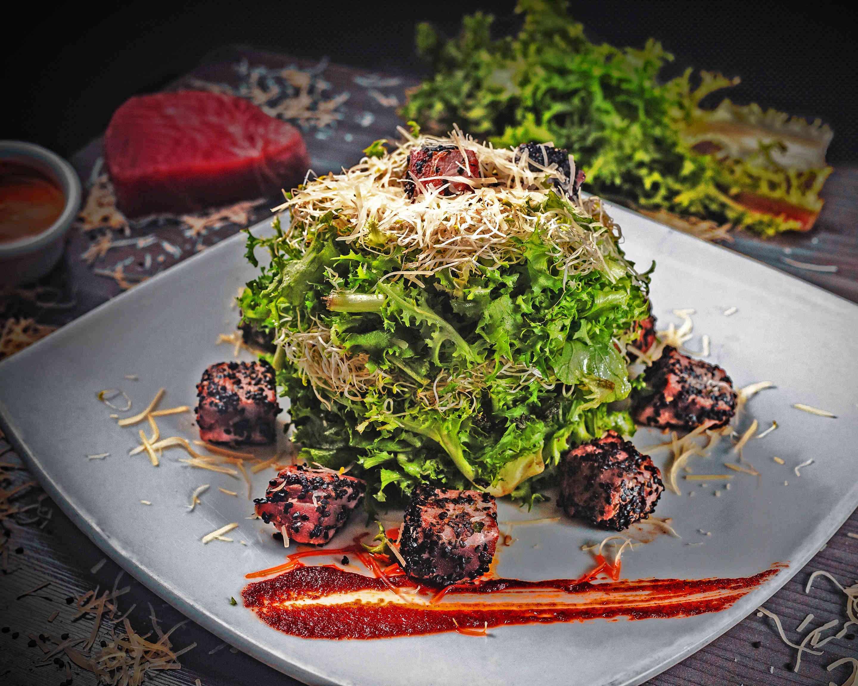 Trocitos de atún sellado, lechuga escarola, arúgula, berro, queso parmesano y germen de soya.