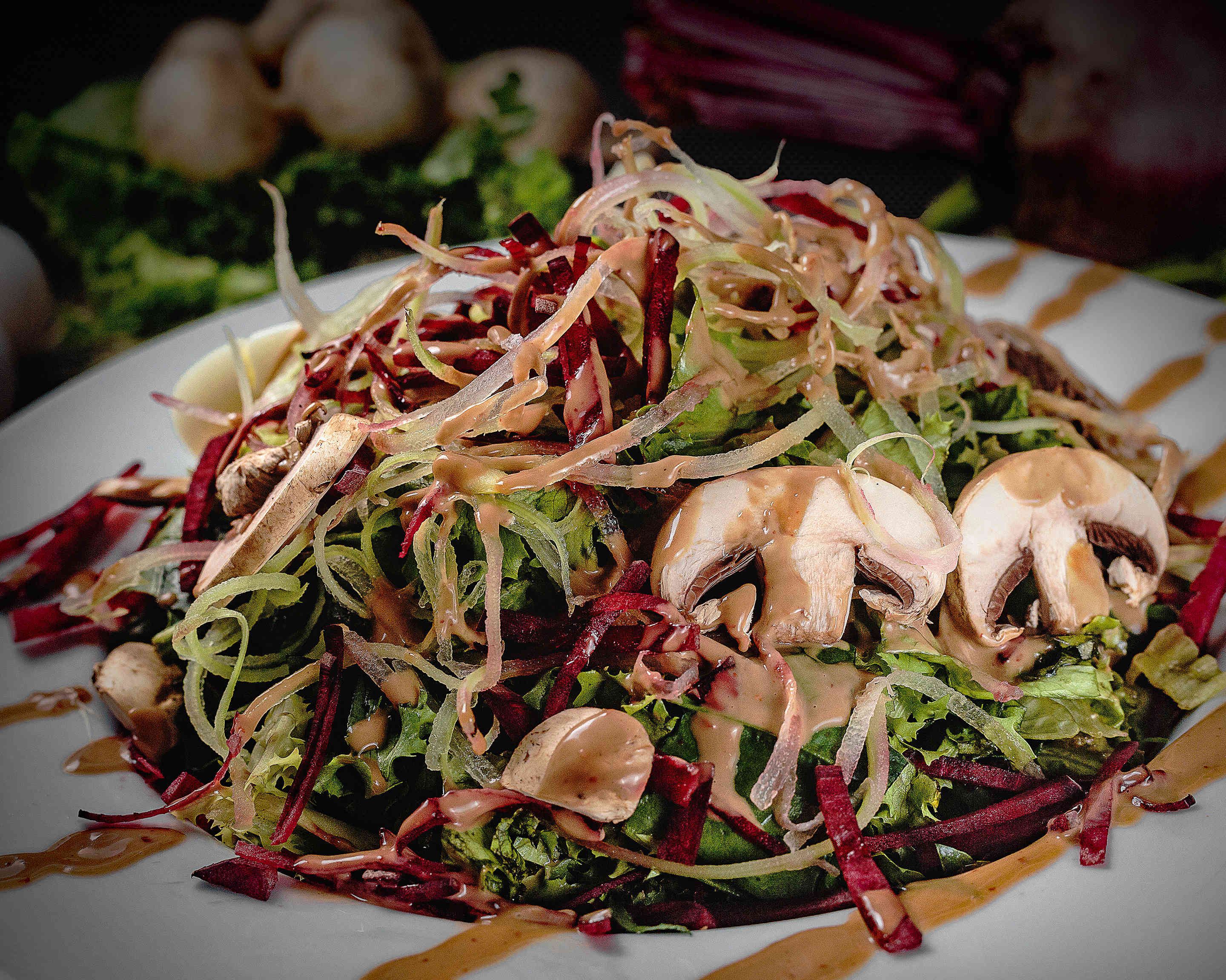 Mezcla de lechugas, berro, espinaca, apio, betabel, champiñón, huevo y tocino.