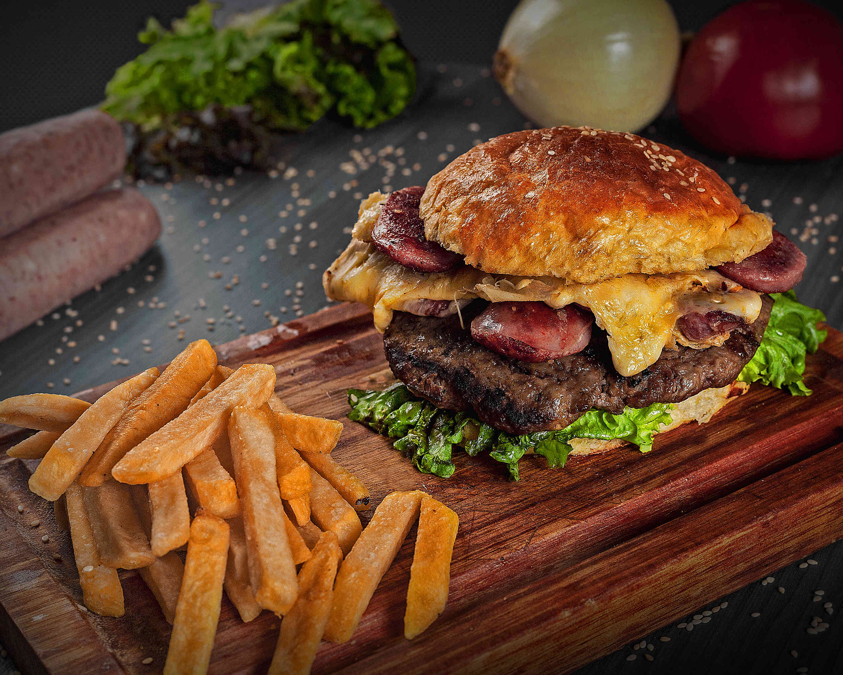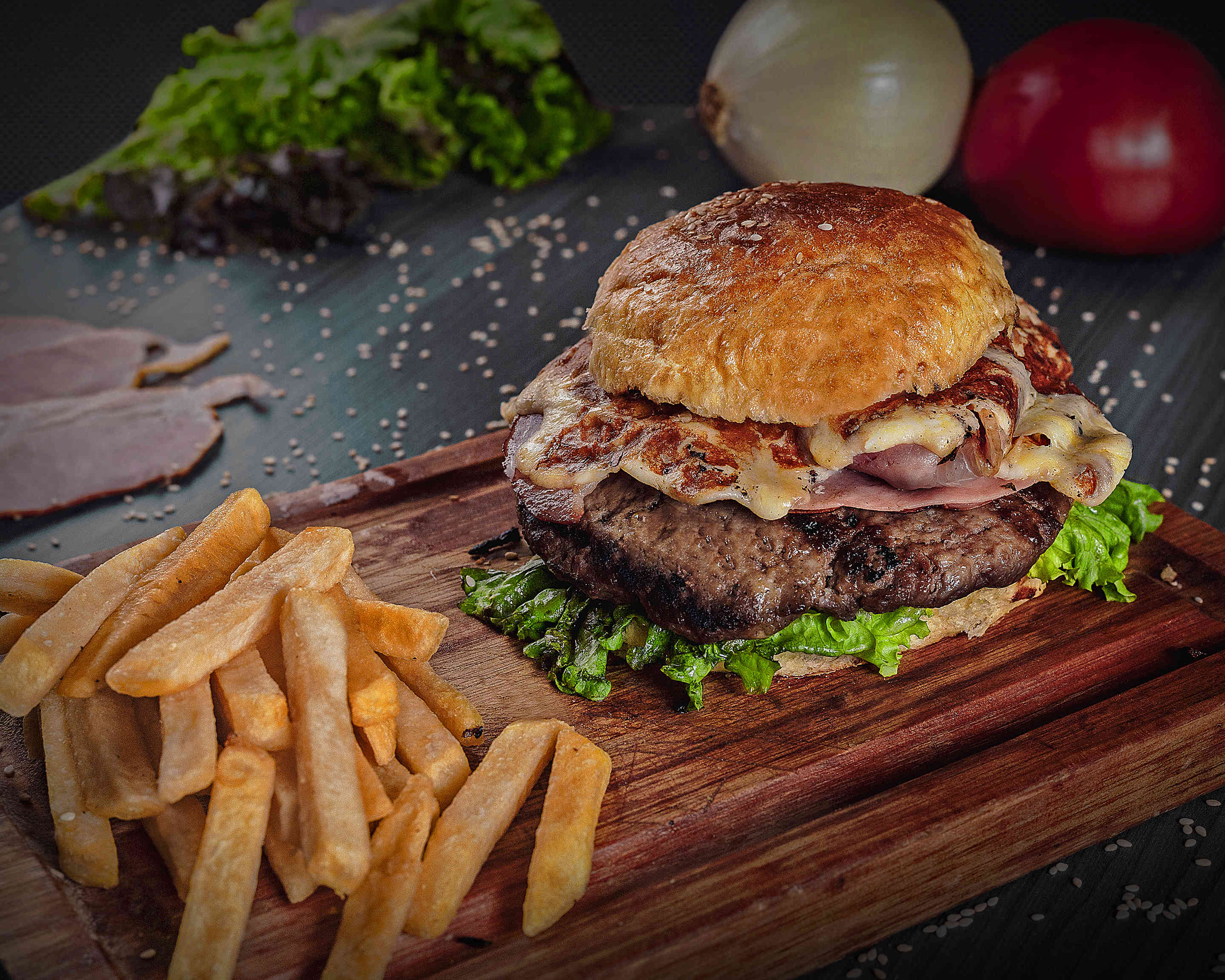 Con queso, jamón, tocino y papas a la francesa.