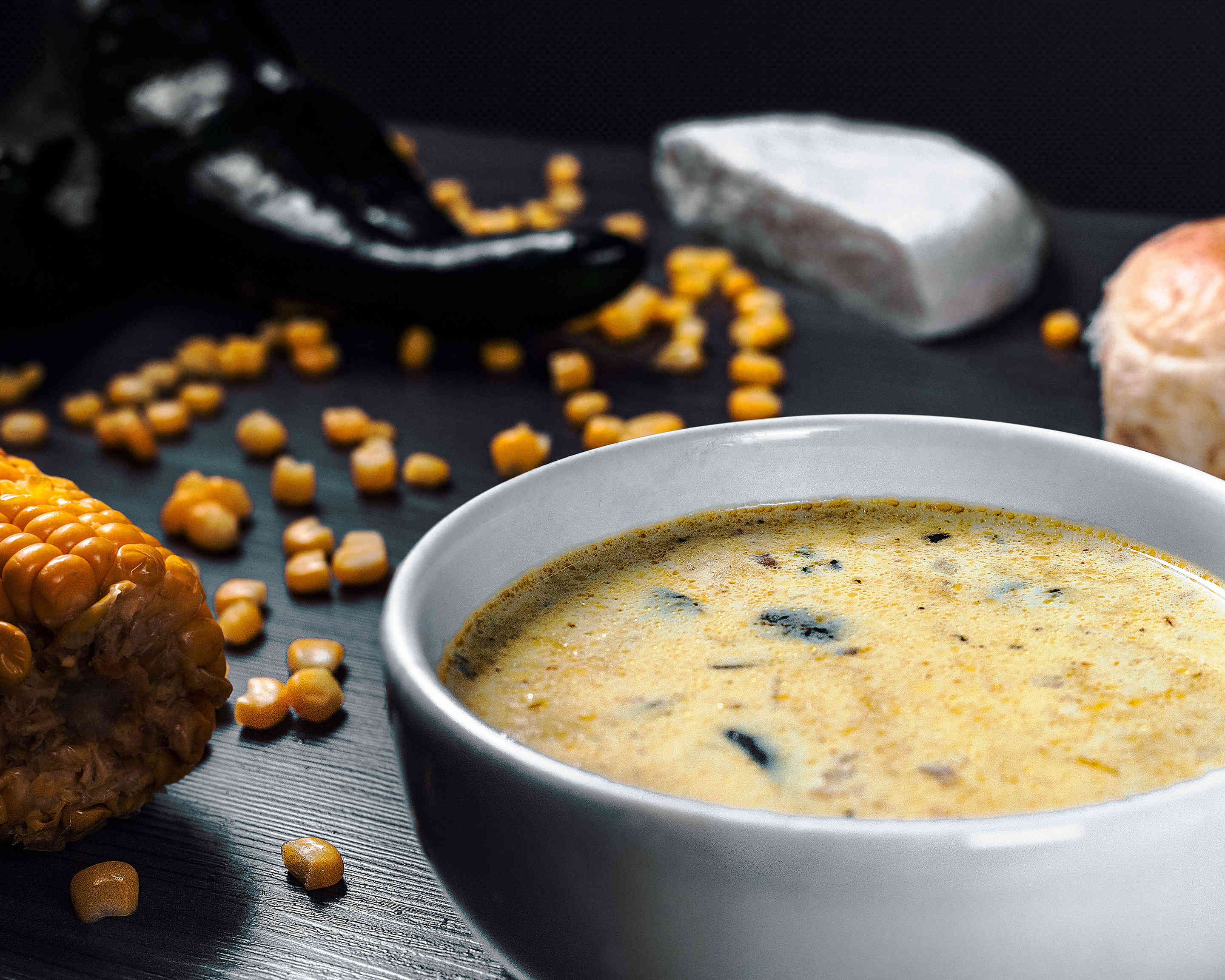 Exquisita crema con elote, chile poblano y queso.