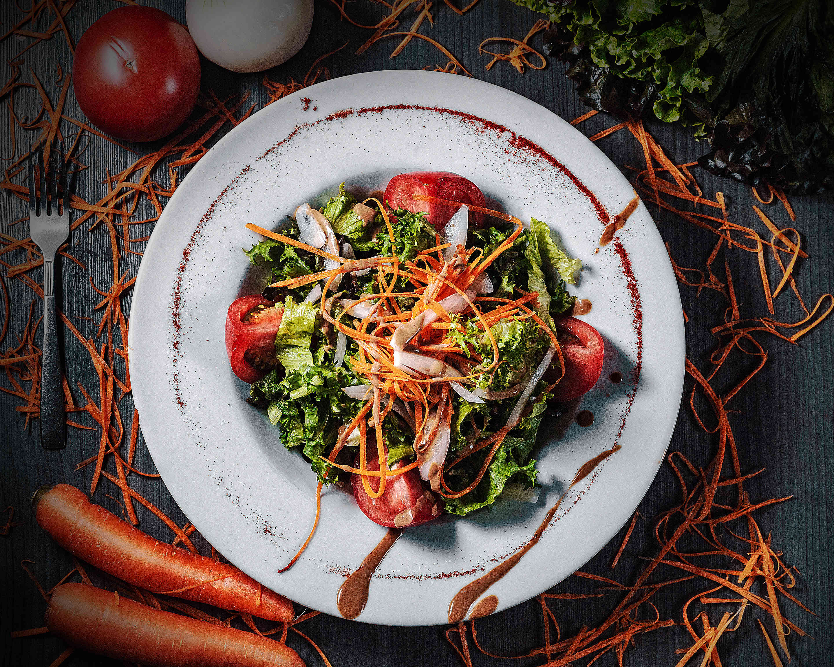 Mezcla de lechugas, jitomate, zanahoria y cebolla.