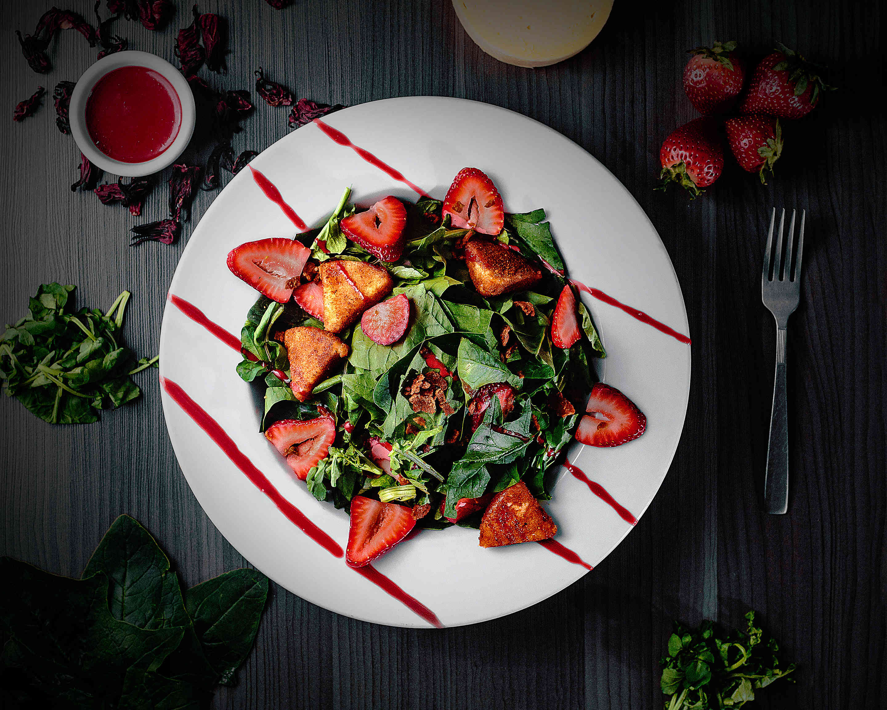 Espinaca, berro, fresa, queso provoleta y tocino.