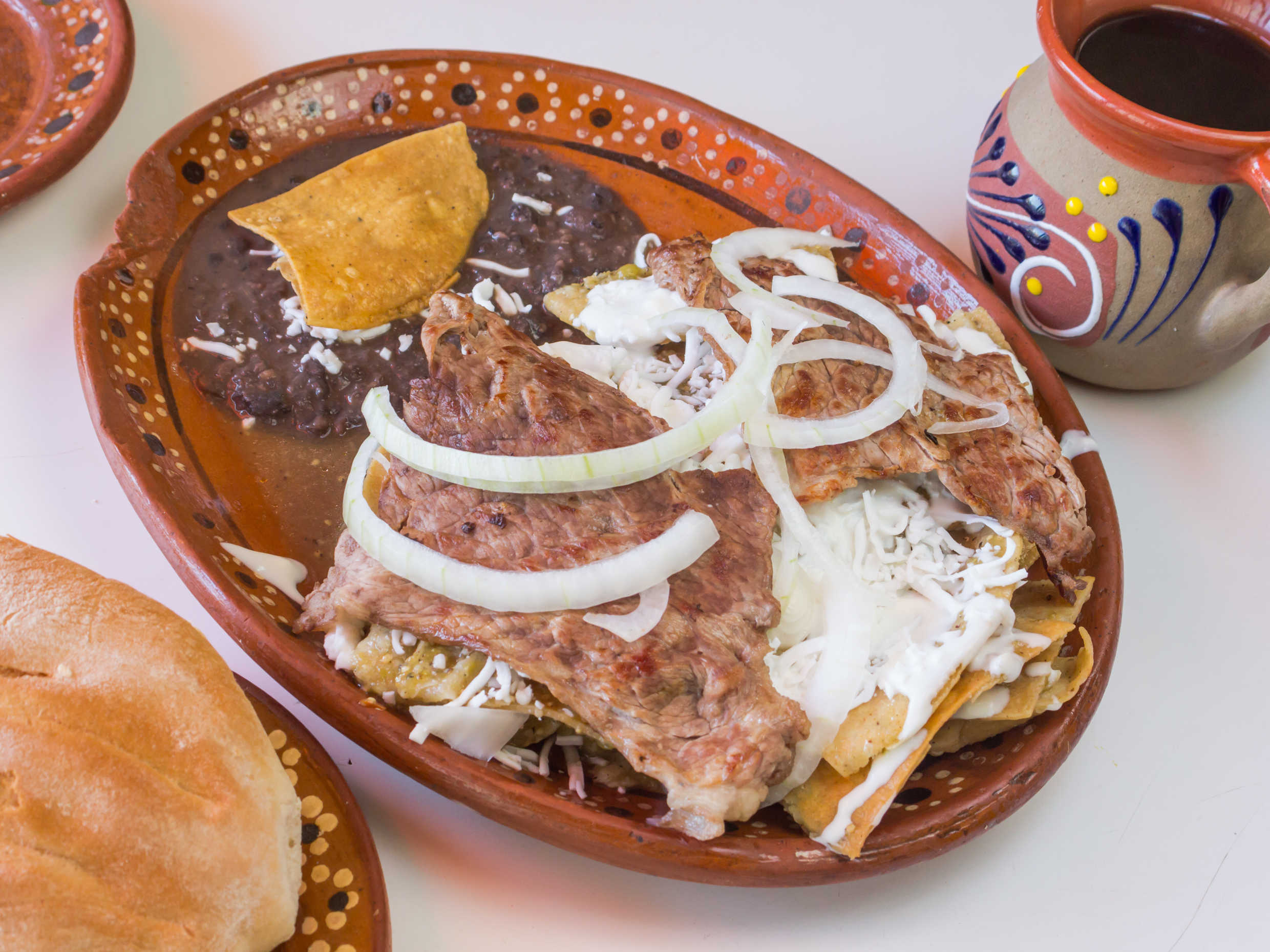 Chilaquiles verdes, tocino, bistec y queso Oaxaca.