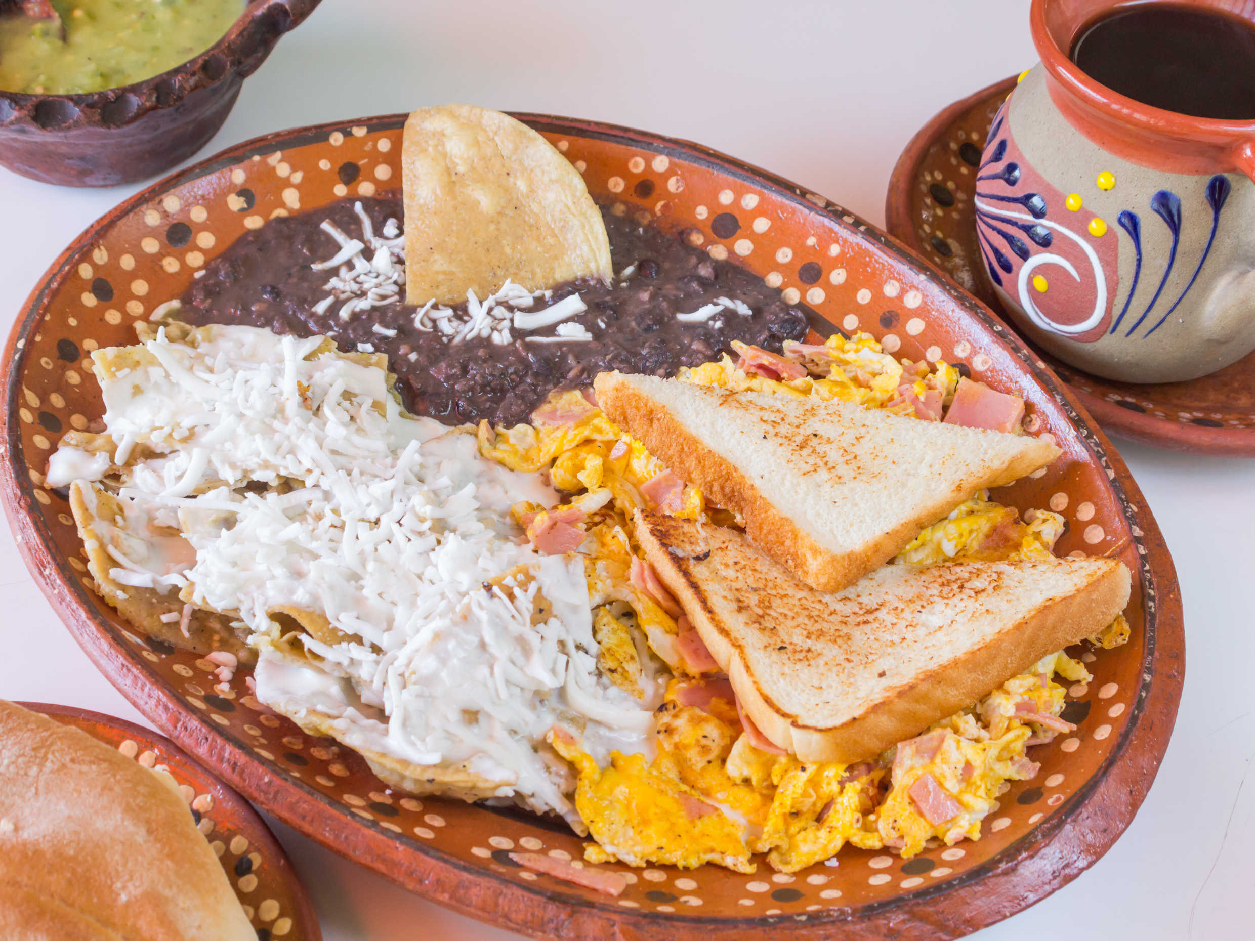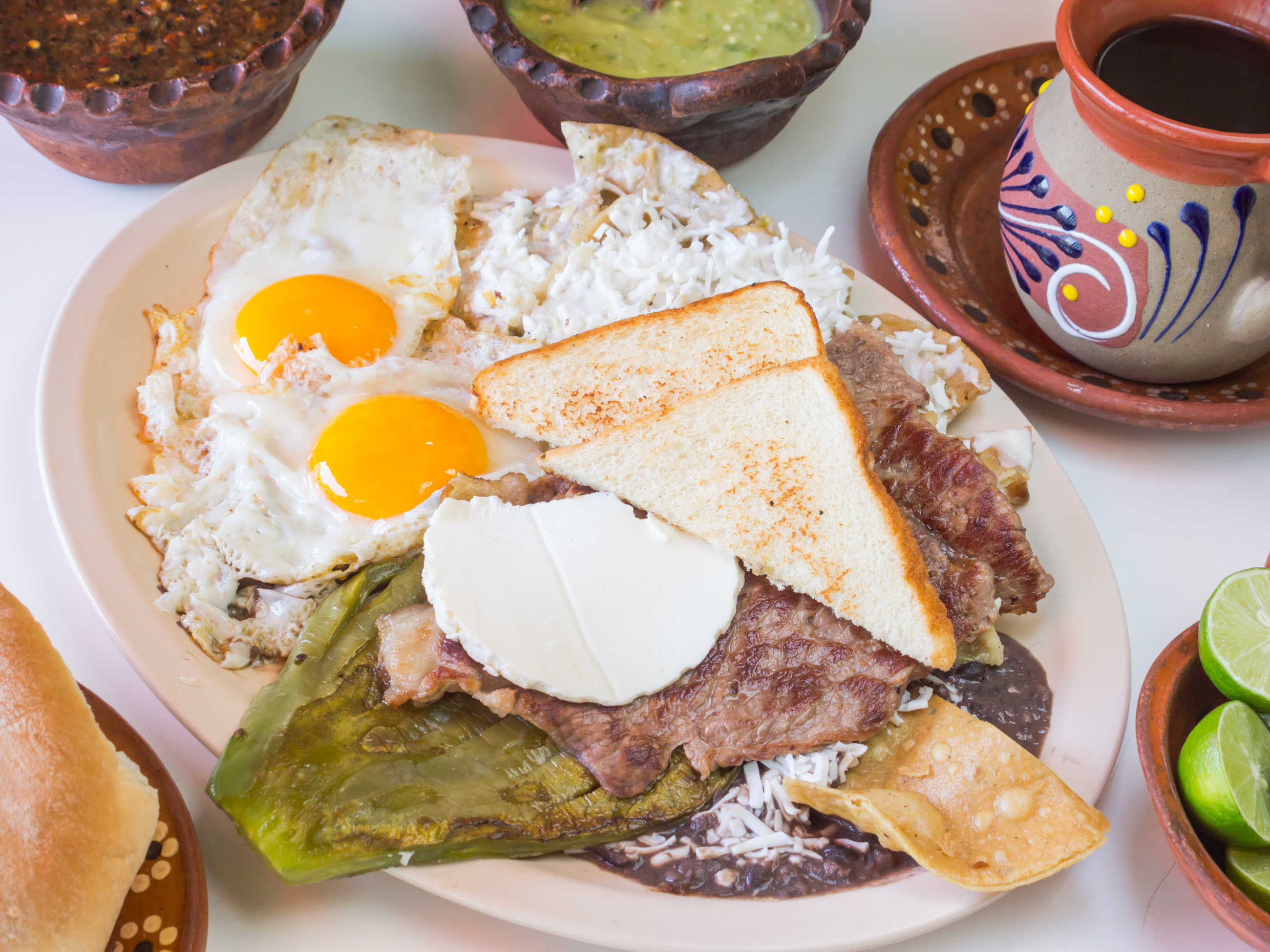 Arrachera, chilaquiles, quesadilla,2 huevos,nopal, queso panela, agua ó café de olla,pan tostado, tortillas ó pan telera