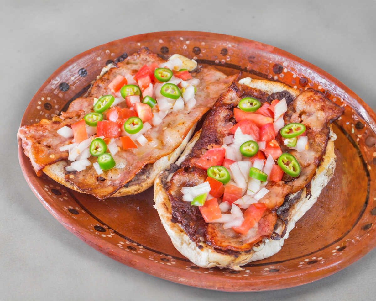 2 Mitades de pan, frijoles, queso gratinado y pico de gallo.