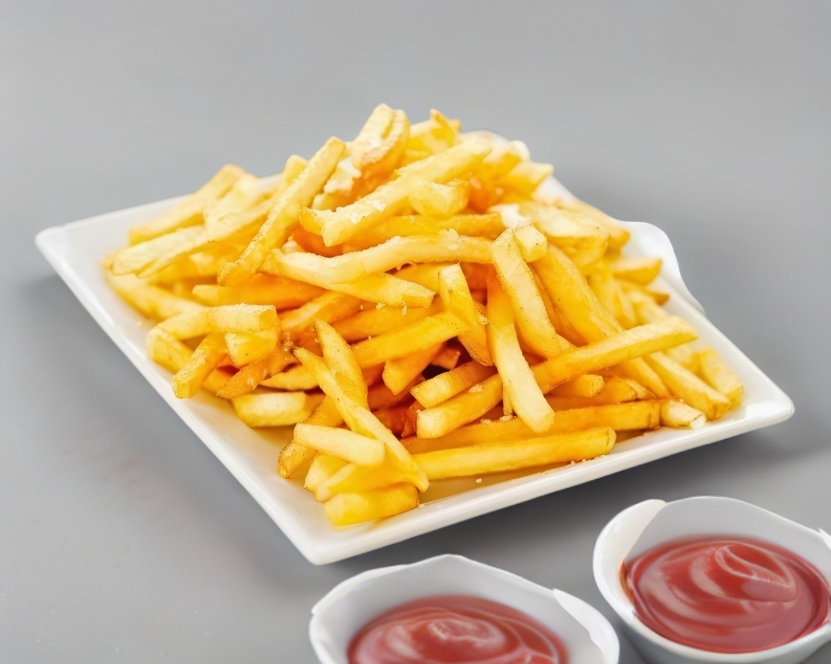 Papas a la francesa con queso Oaxaca fundido y tocino.