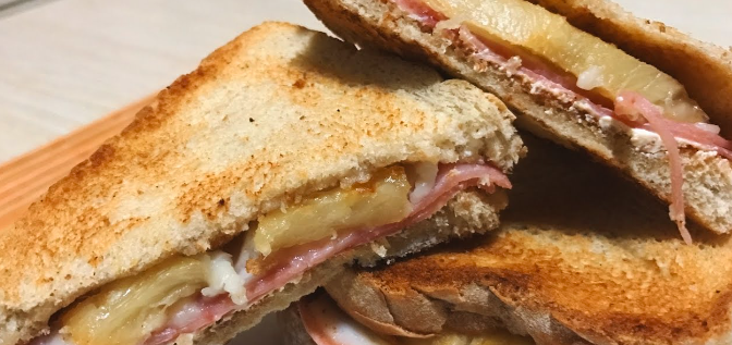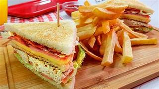 3 Capas de pan, jamón, piña, queso Oaxaca, jitomate, cebolla, aguacate, lechuga, pepino y papas a la francesa.