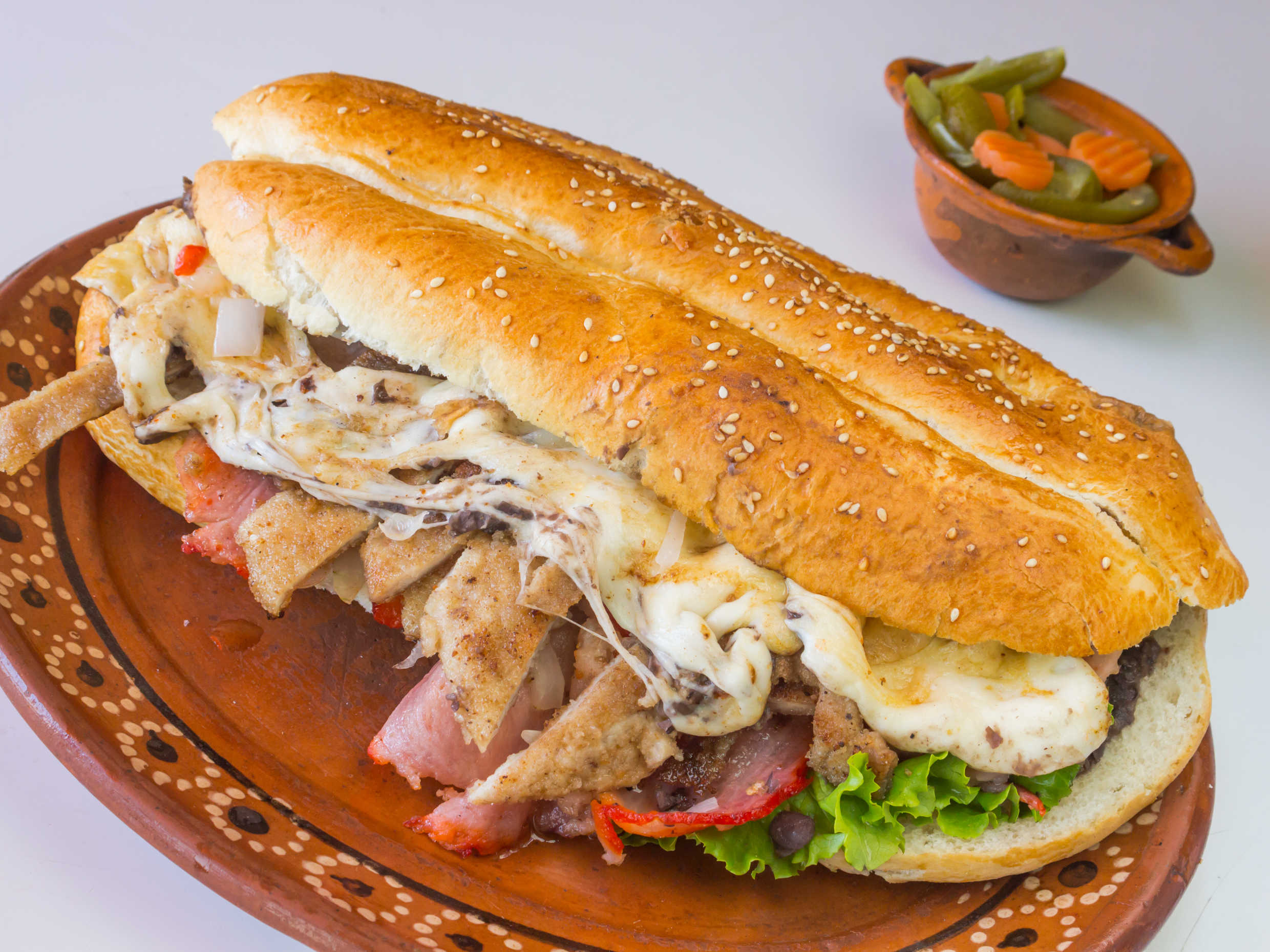 3 Capas de pan, salchichas, queso Oaxaca, jitomate, cebolla, aguacate, lechuga, pepino y papas a la francesa.