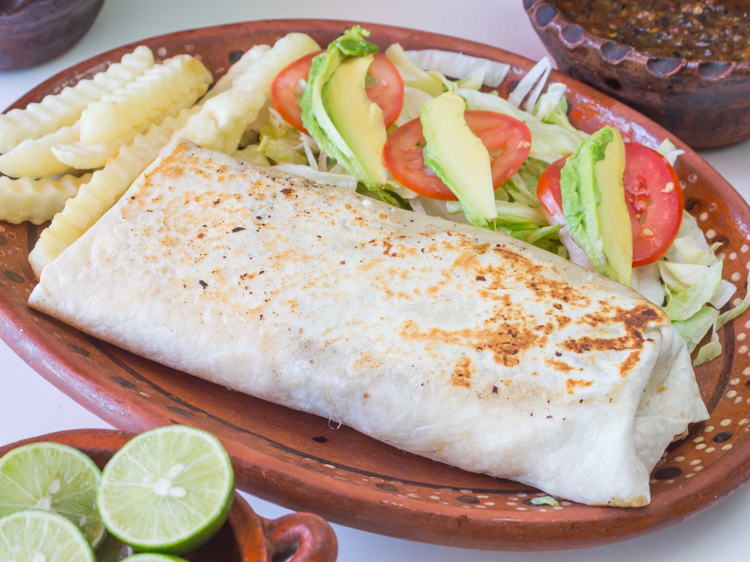 Burrito de pollo, queso Oaxaca, verduras y papas a la francesa.