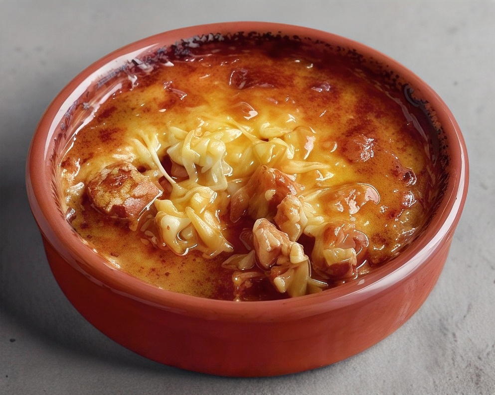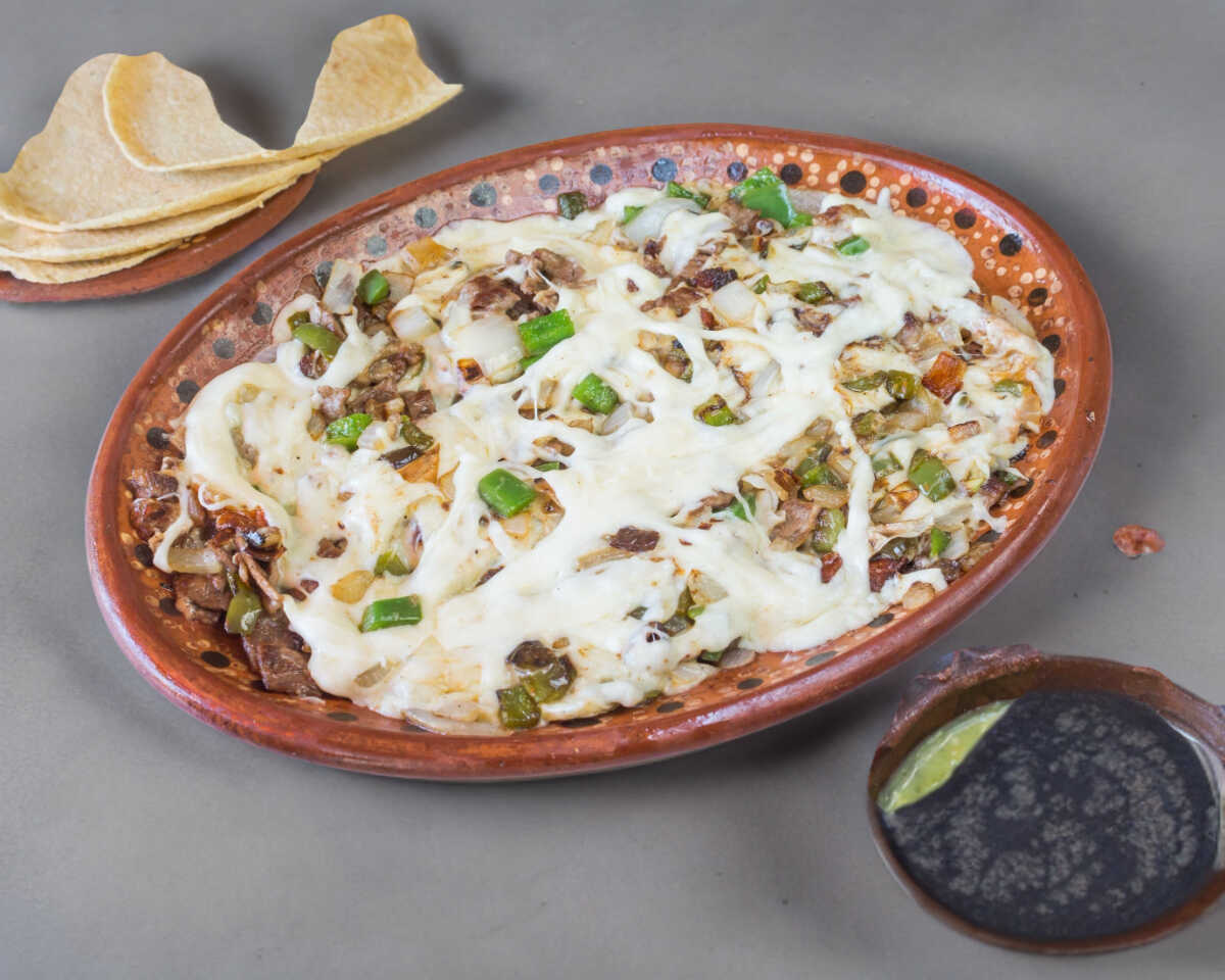 Pimiento morrón, cebolla, bistec, tocino y queso Oaxaca.