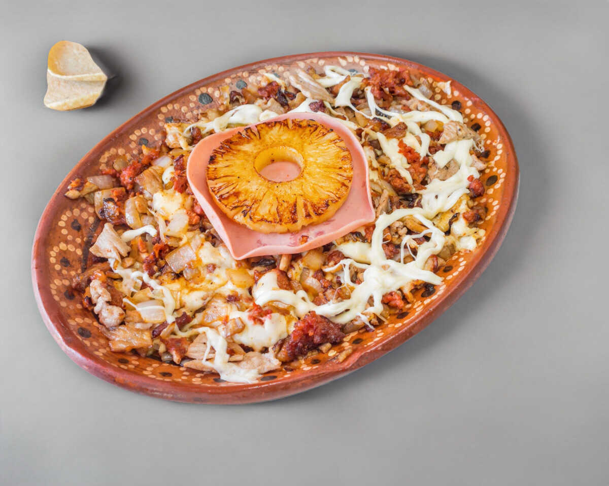 Bistec de res, bistec de cerdo, chorizo, pastor, tocino, queso Oaxaca, jamón y piña.