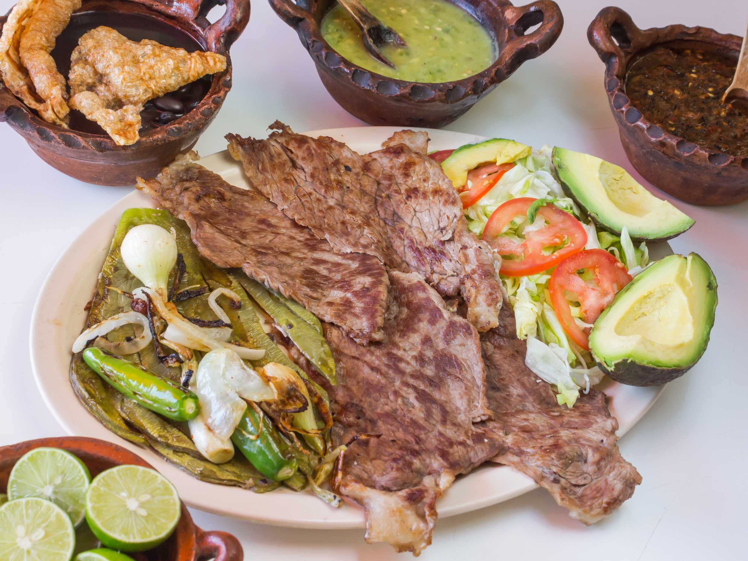 Carne de 200 g acompañado de frijoles charros, nopales, cebolla, ensalada y una quesadilla de queso.