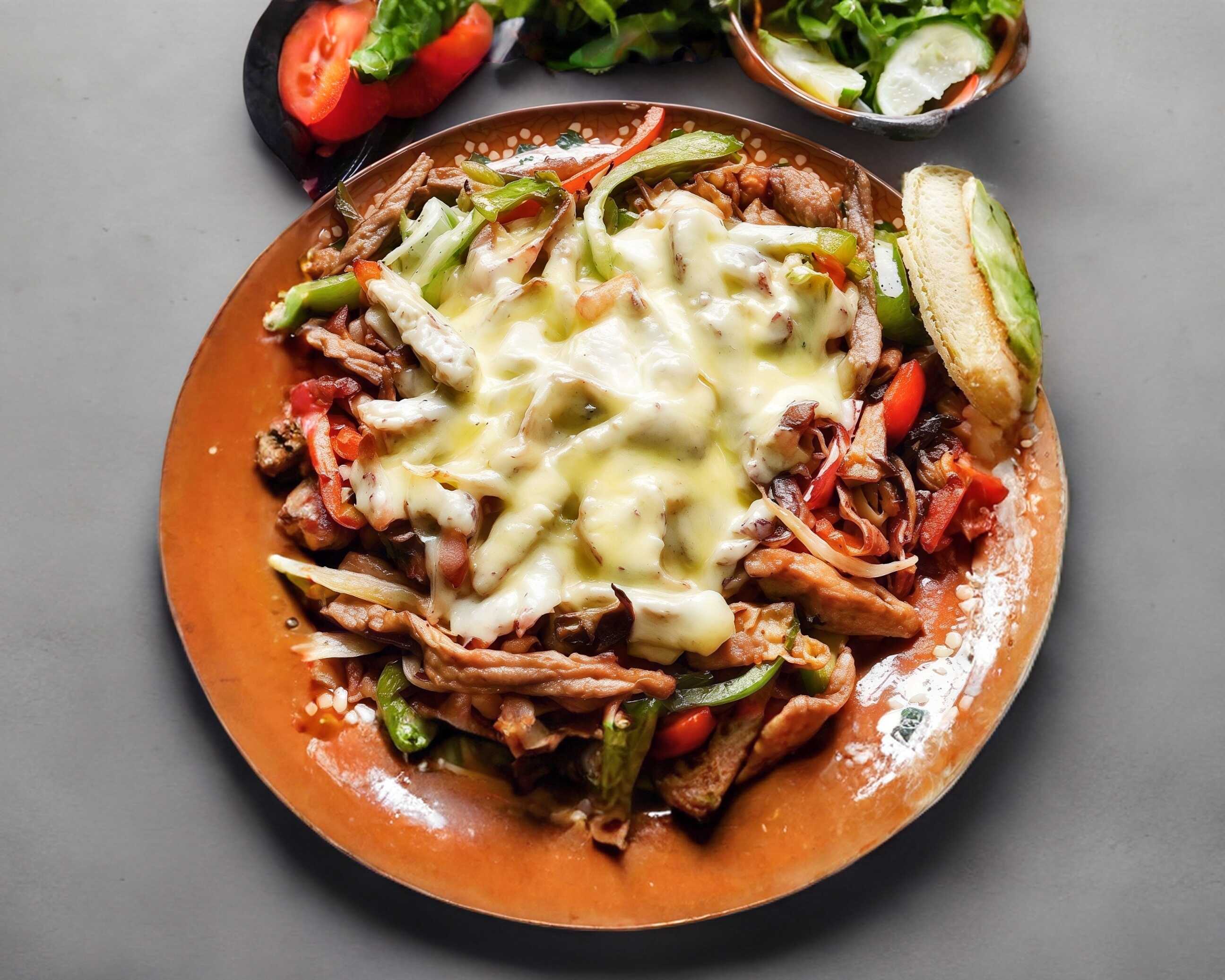 250g de Bistec acompañado de chile morrón, cebolla y queso Oaxaca gratinado al sarten, con una pequeña porción de papas.