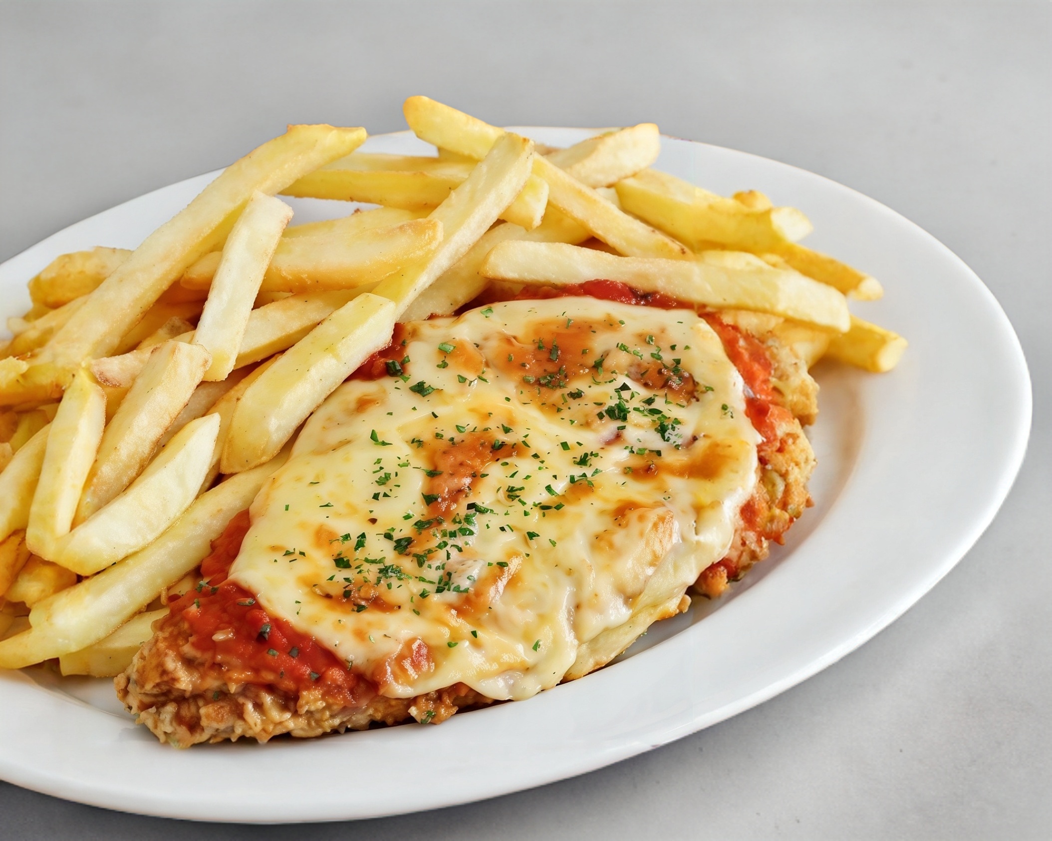 Milanesa de res bañada de salsa de jitomate, jamón y queso gratinado acompañada de papas a la francesa.