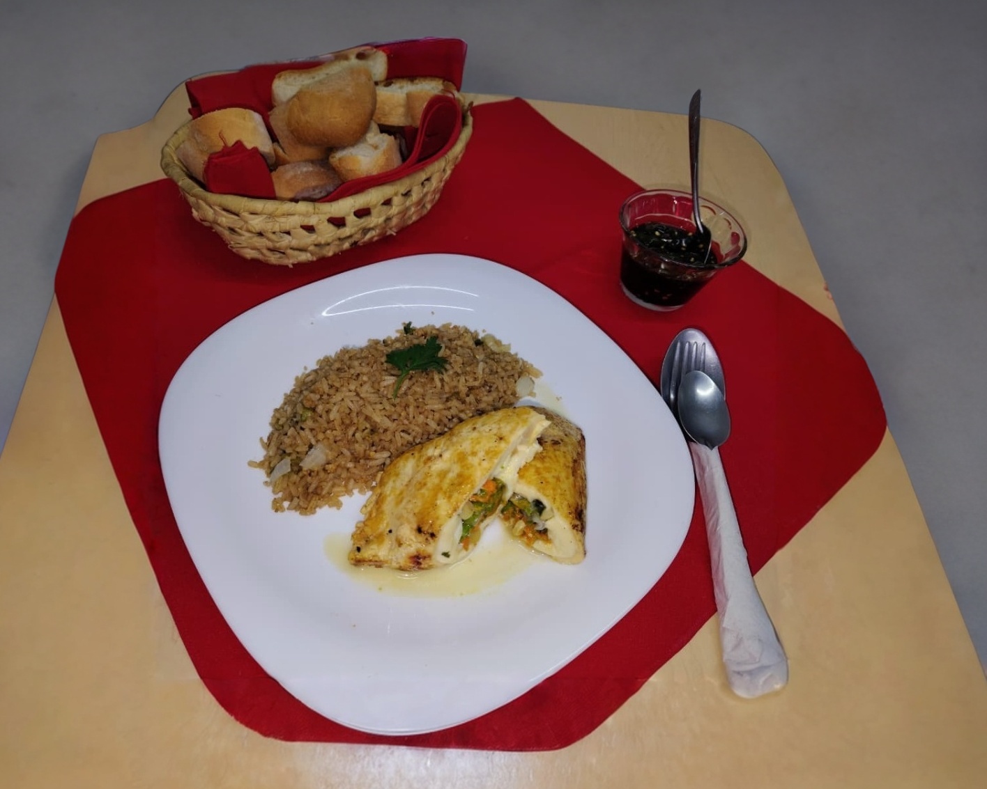 Pechuga Empanizada rellena de Queso Oaxaca flor de calabaza y granos de Elote acompañada de pasta y papas a la francesa